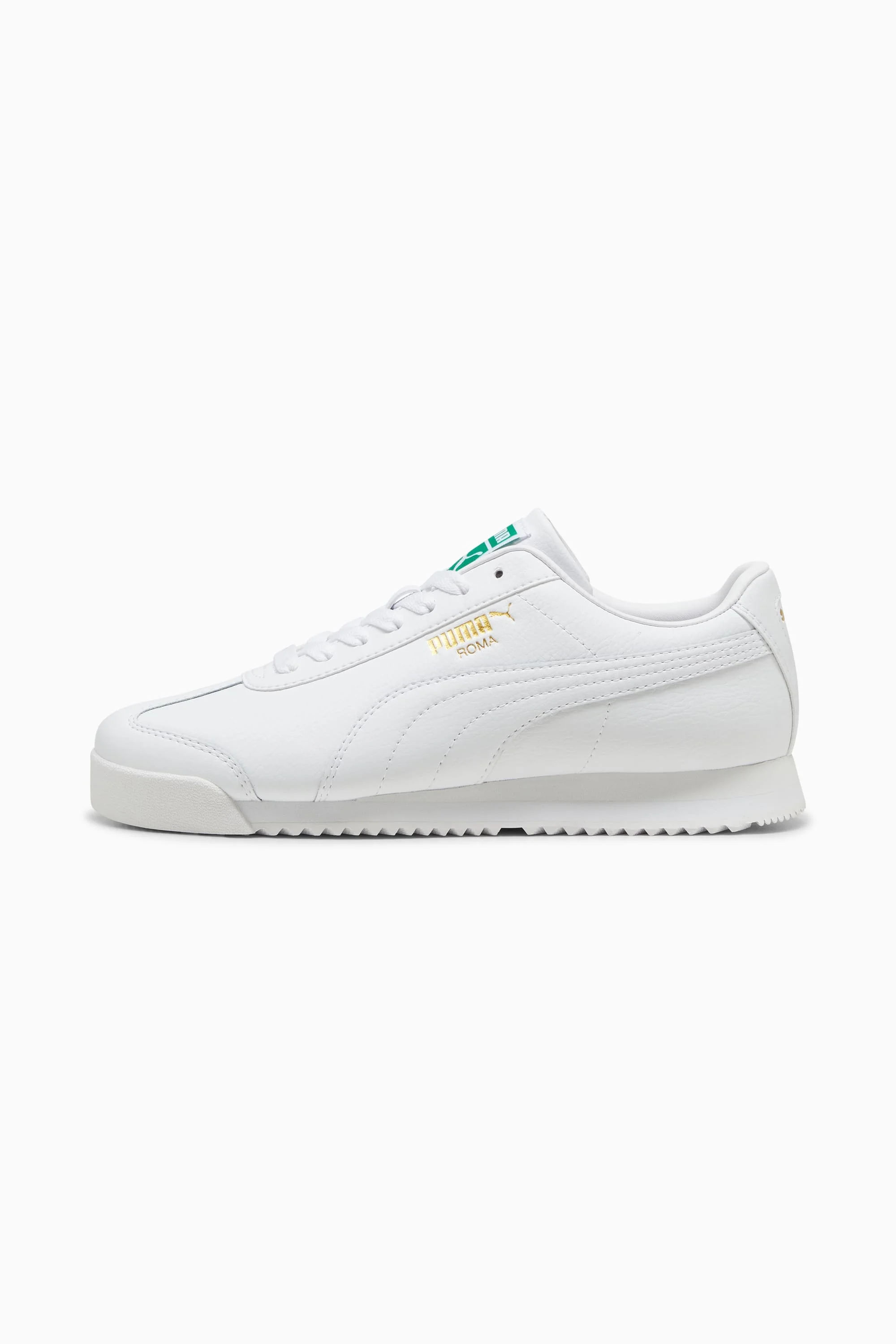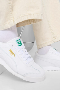 PRODUCT STORY Straight out of the PUMA 1968 archives comes the PUMA Roma. This lightweight trainer comes fully equipped with a thick, padded tongue, orthopaedic arch supports and EVA midsoles for premium comfort wherever you go. FEATURES & BENEFITS - ProFoam: Lightweight EVA designed to cushion your landing and propel your next step - PUMA's leather products support responsible manufacturing via the Leather Working Group. www.leatherworkinggroup.com DETAILS - Style: 396868_03 - Color: PUMA White-Archive Green - Leather and synthetic upper - Synthetic eyestay, toe, tongue and heel overlays - Synthetic lining - Textile sockliner - Rubber and ProFoam midsole - Rubber outsole - PUMA branding details