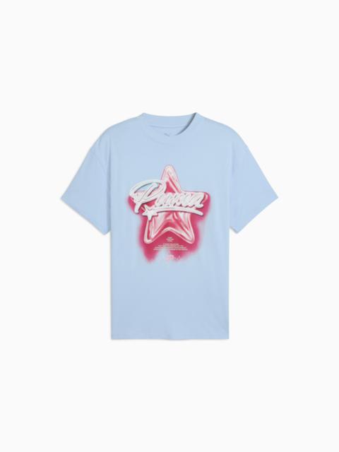 PRODUCT STORY Bring your A-game on and off the court with our basketball lifestyle pieces. Easy-to-wear essentials like hoodies, jerseys, tees, and sweatpants get a fresh update with bold graphics and details inspired by our love for the game. Whether it's warm-ups, post-game, or everyday wear, these pieces are designed to make a statement. FEATURES & BENEFITS - Made with at least 20% recycled cotton. DETAILS - Style: 632846_01 - Color: PUMA White - Fit: Oversized - Main material: Single jersey - Neck: Ribbed crew neck - Short sleeves - Length: Regular MATERIAL INFORMATION - Shell: 100% cotton - Rib: 70% cotton, 30% polyester