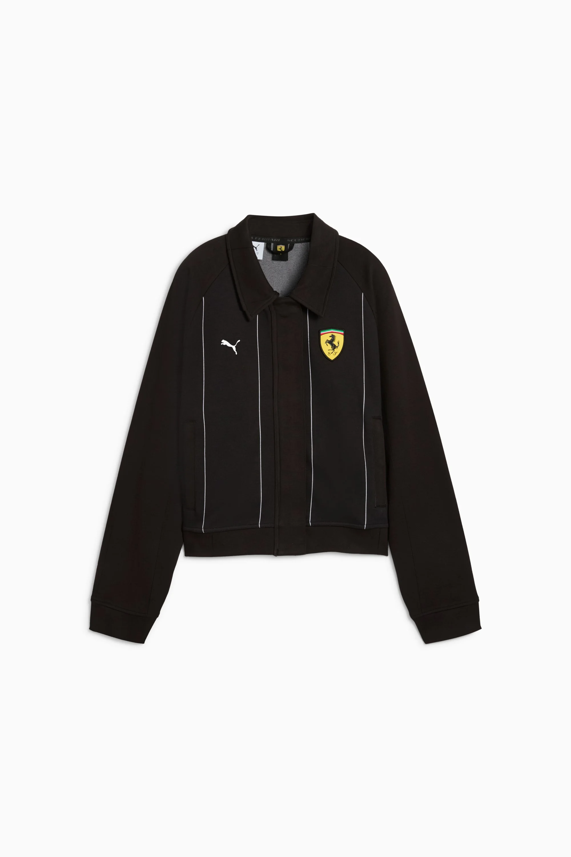 PRODUCT STORY Featuring a regular fit with zipper and snap-buttons, this PUMA jacket blends tradition with innovation. The jacquard pinstriped fabric, and elasticated hem and cuffs add a sleek touch. Show your pride with the Scuderia Ferrari and PUMA Cat logo on the chest. FEATURES & BENEFITS - Made with at least 20% recycled materials DETAILS - Style: 630199_01 - Color: PUMA Black - Regular fit - Main material: Spacer - Cropped length - Hood - Long sleeves - Kangaroo pocket - Jacquard pinstriped fabric - PUMA Cat logo on the right chest - Scuderia Ferrari logo on the left chest MATERIAL INFORMATION - Upper Pocket Bag: 100% polyester - Shell: 75% cotton, 25% polyester - Lower Pocket Bag: 75% cotton, 25% polyester
