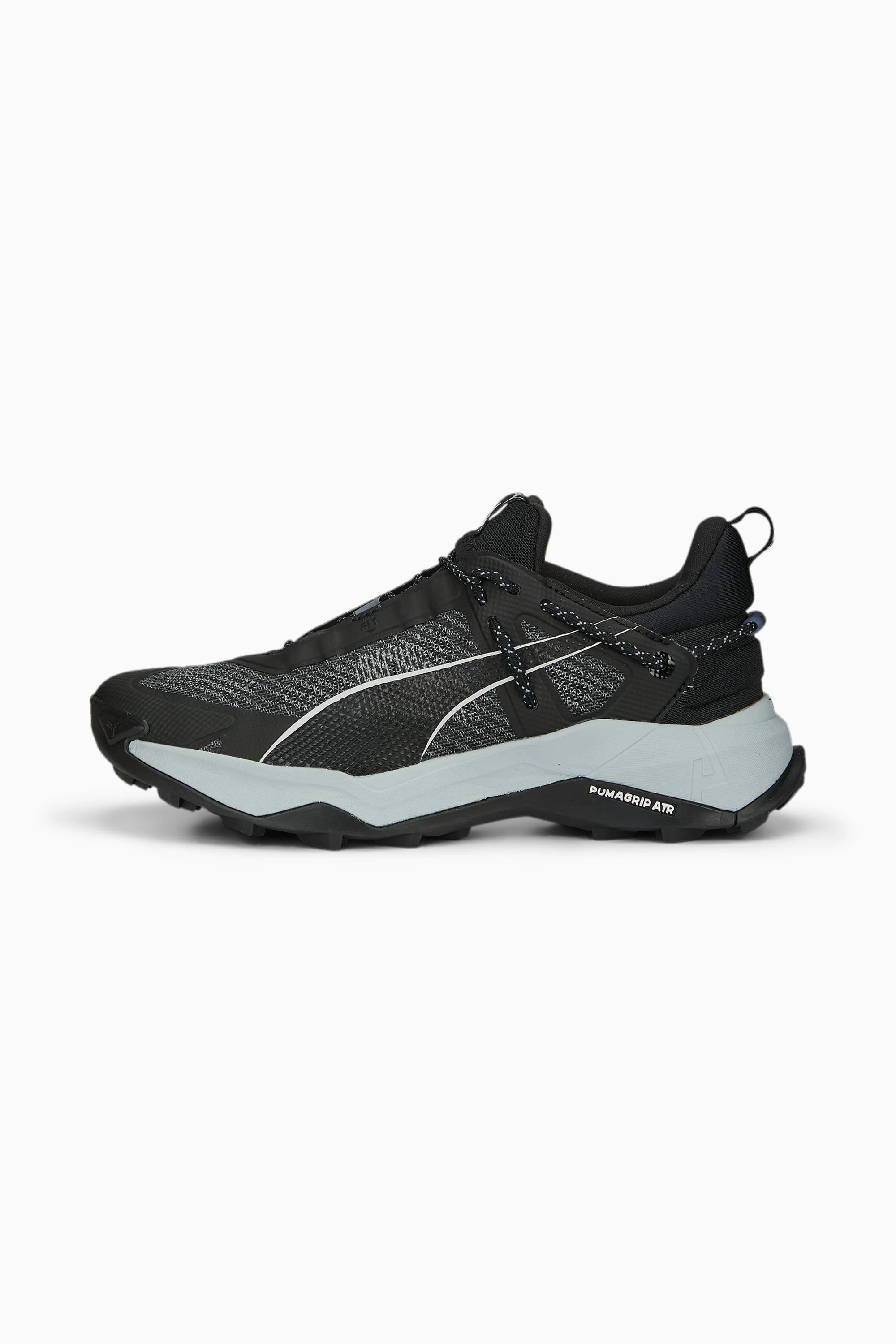 PRODUCT STORY Introducing our first hiking-specific shoe: the Explore NITRO™. It's designed for all trails, from flat and gravelly to steep and rocky, with a combination of NITROFOAM™ and PROFOAMLITE through the midsole maximising comfort over any terrain. Throw in a PUMAGRIP ATR outsole and a unique collar shape – complete with integrated, heel supporting lacing system – and you have your next trail companion. Get ready to tackle and terrain, no matter the season. FEATURES & BENEFITS - NITRO™: Advanced nitrogen-infused foam designed to provide superior responsiveness and cushioning in a lightweight package - PROFOAMLITE: Extremely lightweight EVA designed to cushion your landing and propel each step - PUMAGRIP ATR: Trail-ready performance rubber compound designed for traction on ice, mud, and unstable surfaces - FOREVER BETTER: The upper of this shoe is made with at least 50% recycled materials as a step toward a better future DETAILS - Style: 377855_01 - Color: PUMA Black-Platinum Gray - Booty construction - Mono-mesh upper - Flared midfoot shape - Toe drainage port - OPTIFIT adaptive fit system designed to offer a secure lockdown and support during exercise - Cushioning level: Max - Heel-to-toe drop: 6mm - Best for: Neutral pronators MATERIAL INFORMATION - Sockliner: 100% Textile - Outsole: 100% Rubber - Upper: 50.18% Synthetic, 49.82% Textile - Lining: 100% Textile