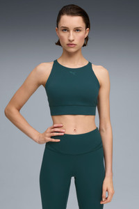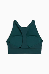 PRODUCT STORY Own your workout with high-neck coverage and medium-impact support. Made with SHAPELUXE for a smooth, form-fitting feel and LYCRA® ADAPTIV fiber for unrestricted movement. Removable pads and dryCELL technology keep you comfortable and dry, from studio sessions to daily errands. FEATURES & BENEFITS - dryCELL: Performance technology designed to wick moisture from the body and keep you free of sweat during exercise - LYCRA® ADAPTIV: Fibre in an innovative, engineered seamless construction delivers on fit and shape retention while providing form-fitting compression that moves with you - Made with at least 50% recycled materials. DETAILS - Style: 528138_75 - Color: Green Terrain - Fit: Tight - Main material: Interlock - High neck - Removable pads - Support: recommended for mid-impact workouts. MATERIAL INFORMATION - Lining: 94% polyester, 6% elastane - Shell: 82% nylon, 18% elastane