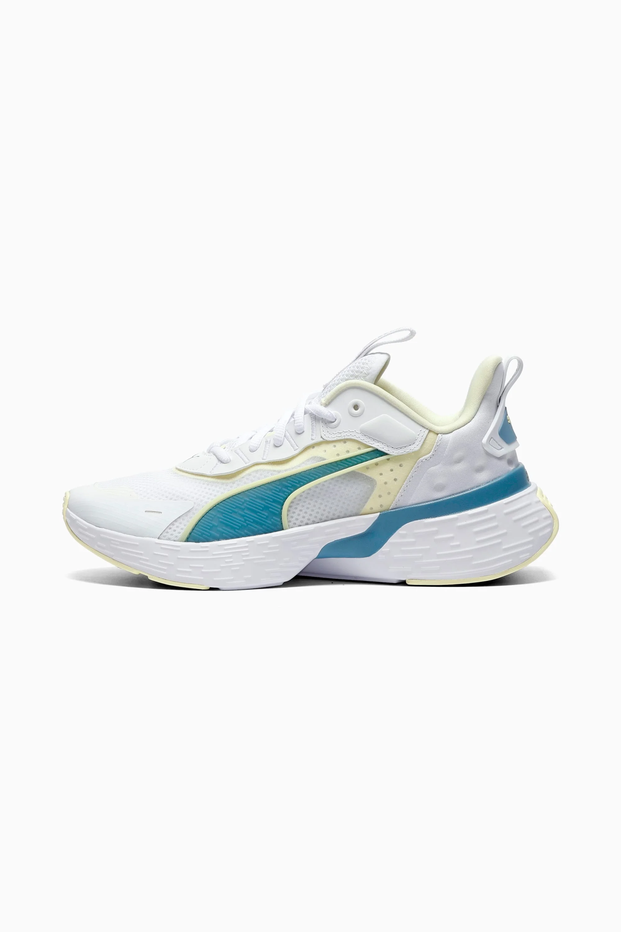 PRODUCT STORY Puma SOFTRIDE Sway features PUMA's proprietary SOFTRIDE EVA technology to offer all-day cushioning on a feminine upper that uses layered materials to create a style that's bold, active, and 100% you. FEATURES & BENEFITS - SOFTFOAM+: Step-in comfort sockliner designed to provide soft cushioning thanks to its extra thick heel - SOFTRIDE: Soft foam designed for all-day cushioning and comfort - The upper of the shoes is made with at least 20% recycled materials. DETAILS - Style: 310318_17 - Color: PUMA White-Gold Moon - Outsole: Synthetic and rubber - Midsole: SOFTRIDE foam - Upper: Layered, mixed materials - Jewel piece in the midsole - TPU cage - Webbing: Lock down fit - Closure: Laces - Rounded toe MATERIAL INFORMATION - Midsole: 100% Synthetic - Sockliner: 100% Textile - Outsole: 57.20% Synthetic, 42.80% Rubber - Upper: 55.49% Textile, 44.51% Synthetic - Lining: 100% Textile