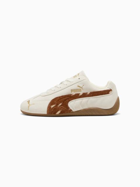 PRODUCT STORY Merging the worlds of ballet and racing: the Speedcat Ballet, inspired by archive ballet flats and merging it wit the DNA of Speedcat. Own the low profile trend with the most iconic silhouette of PUMA's archive. This execution features a suede upper base and a pony hair formstrip with a deer pattern. DETAILS - Style: 408568_01 - Color: Warm White-Caramel Latte - Width: Regular - Toe type: Rounded - Fastener: Elastic - Heel type: Flat MATERIAL INFORMATION - Sockliner: 100% Synthetic - Outsole: 100% Rubber - Upper: 65.93% Leather - cow, 18.91% Textile, 15.16% Coat / Fur - Lining: 100% Synthetic