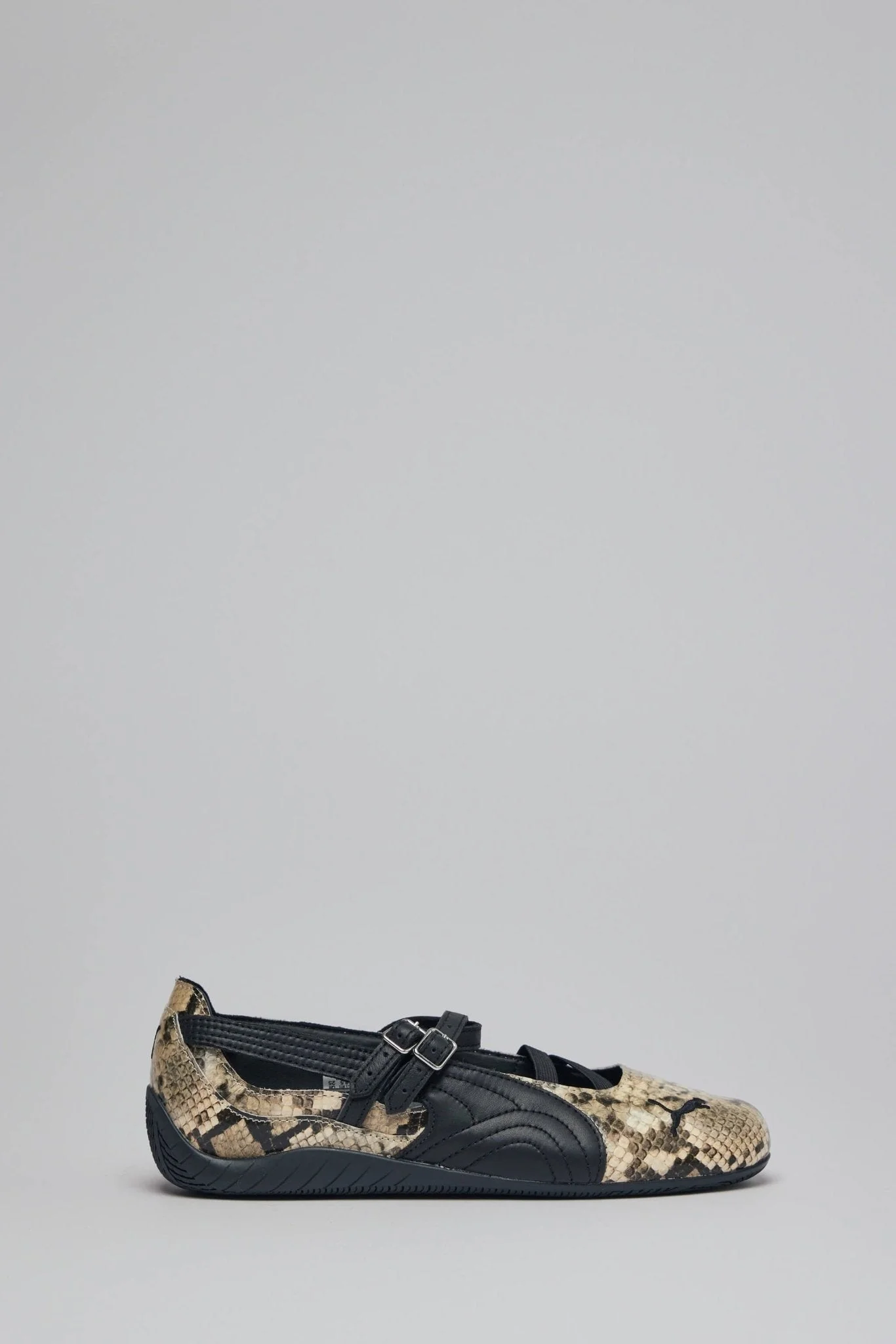 SKU: 155594 Brand style: 405326 01 Flats with a snakeskin pattern and black detailing, designed for a stylish yet comfortable fit. They feature dual straps across the top and detailed stitching along the sides. - Snakeskin patterned exterior - Black dual straps - Round toe design - Textured rubber sole - Buckle closure - Contrasting black detailing - Textured stitching - Low heel Materials: 100% Leather Upper, 100% Rubber Sole Color: puma black-vapor grey The model is 1.78m (5.8ft) and wears a size EU39. The item fits as expected according to standard sizing. Order your usual size.