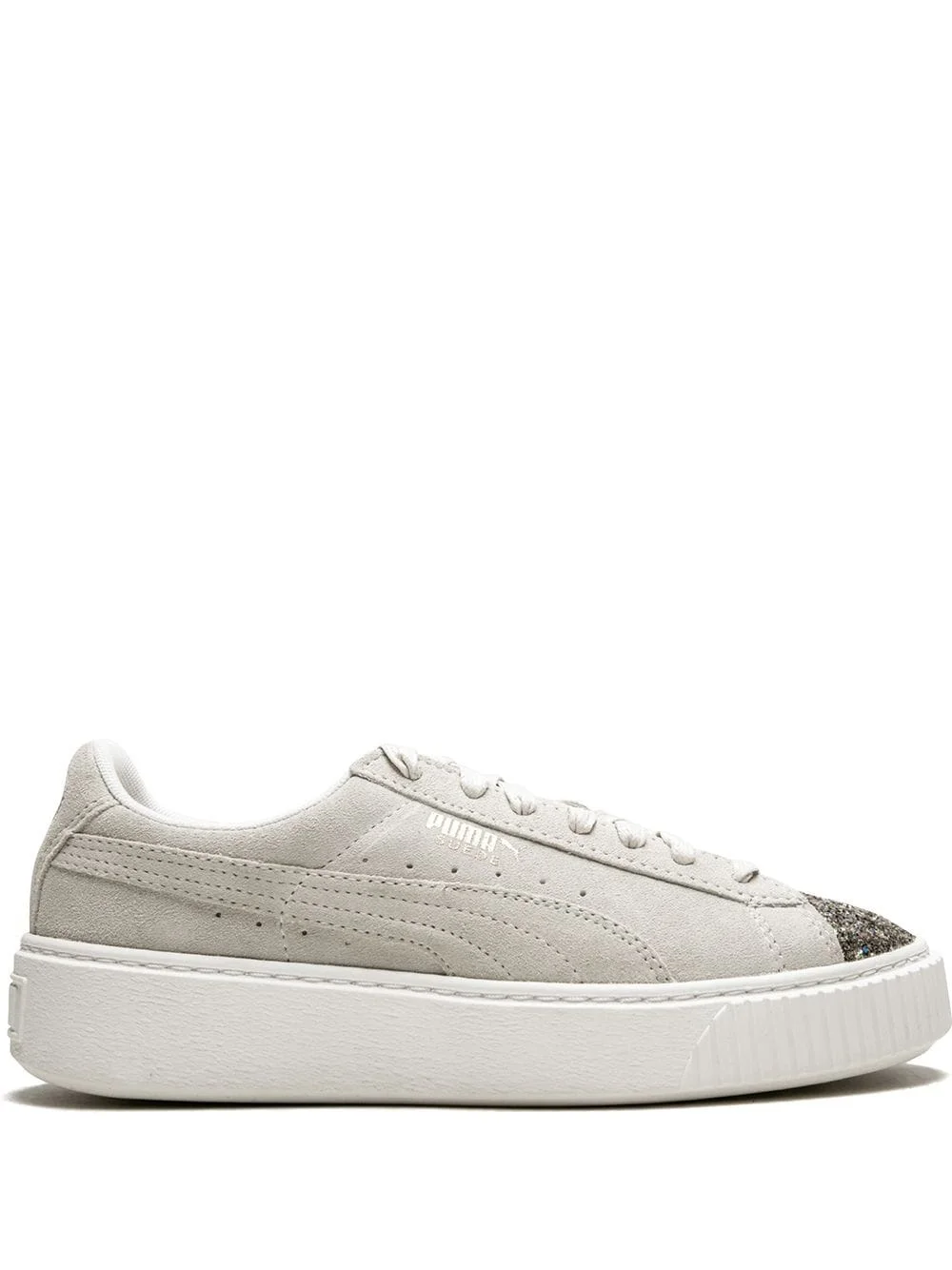 Suede Platform sneakers Ready to sparkle? These grey suede platform sneakers from Puma are finished with a glittered toe cap for a shine with each step you take. Razzle dazzle! Featuring a round toe, a lace-up front fastening, a metallic toe cap, a branded insole and a flat rubber sole. Imported Composition Outer: Suede 100% Sole: Rubber 100% Lining: Polyester 100%