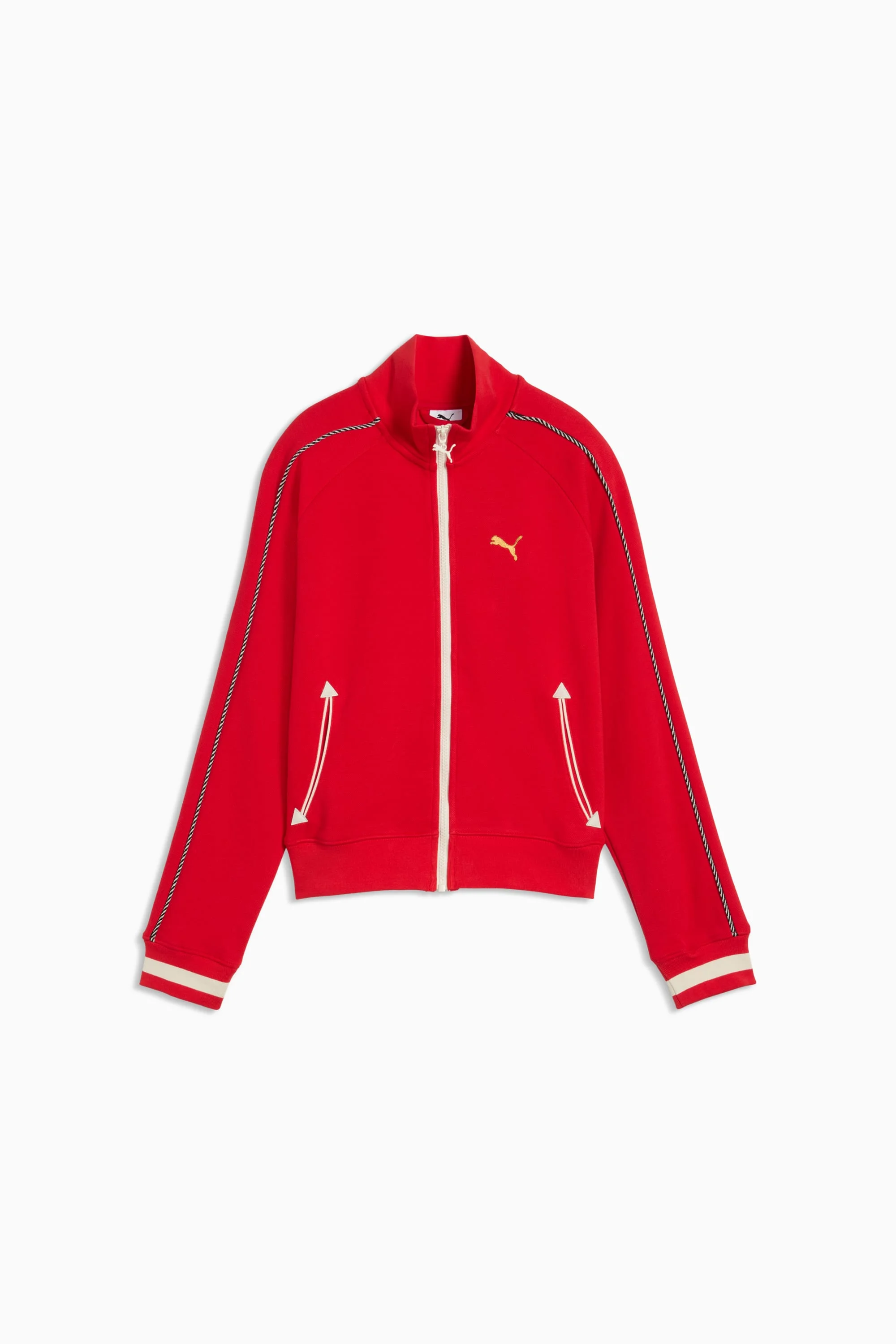PRODUCT STORY The T7 tracksuit made its debut in 1968 and has been changing the game ever since. With its signature side panels, clean cutlines, and unmistakable PUMA DNA, the T7 has achieved icon status. This short track jacket mixes the T7 aesthetic with design details that nod to Las Vegas. FEATURES & BENEFITS - Made with at least 30% recycled materials. DETAILS - Style: 693361_11 - Color: For All Time Red - Fit: Regular - Main material type: Spacer - Neck: Stand up collar - Long sleeves - Lined - Length: Short jacket - Signature T7 details MATERIAL INFORMATION - Shell: 66% cotton, 34% polyester - Pocket Bag: 100% cotton - Rib: 95% cotton, 5% elastane