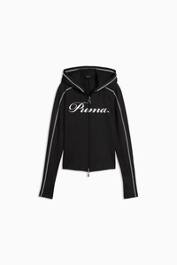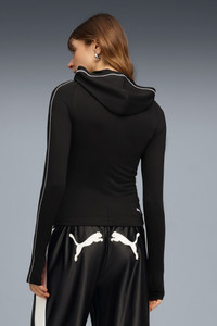 PRODUCT STORY The T7 tracksuit made its debut in 1968 and has been changing the game ever since. With its signature side panels, clean cutlines, and unmistakable PUMA DNA, the T7 has achieved icon status. This season we’ve amplified the classic with a bold colour palette, a range of relaxed and cropped fits, and an oversized PUMA Cat Logo for extra attitude. Signature details like contrast stitching and thumbholes at the cuffs make this hoodie stand out. FEATURES & BENEFITS - Made with at least 50% recycled materials. DETAILS - Style: 637066_01 - Color: PUMA Black - Fit: Slim - Main material type: Single jersey - Hooded - Long sleeves - Thumbholes - Length: Short MATERIAL INFORMATION - Shell: 89% polyester, 11% elastane