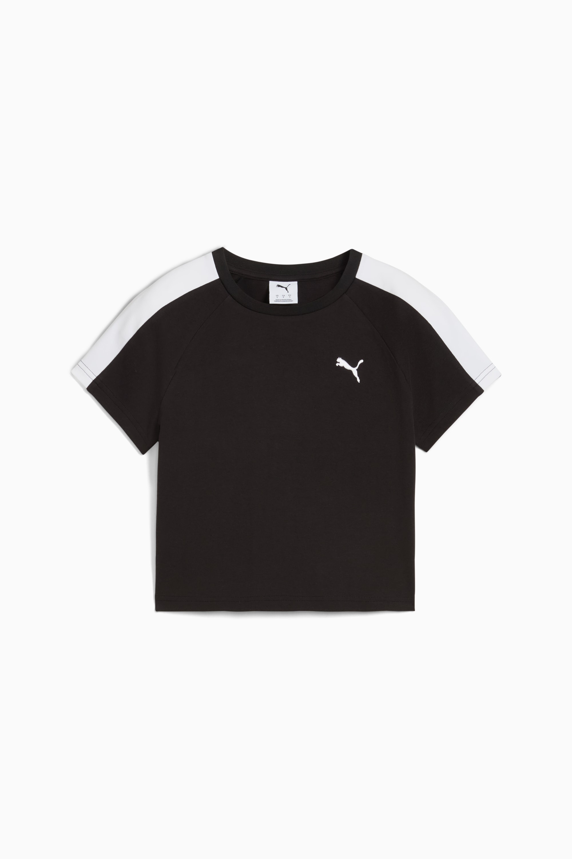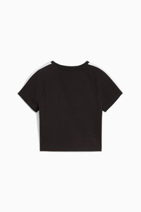 PRODUCT STORY With T7 panel inserts, a ribbed neckline, and the iconic Cat logo, this baby tee is a PUMA Classic. It's perfect for adding a sporty edge to your look. Feel the energy and make a statement every day. FEATURES & BENEFITS - Made with at least 20% recycled cotton DETAILS - Style: 629802_01 - Color: PUMA Black - Slim fit - Single jersey fabric - Cropped length - Crew neck - PUMA branding details