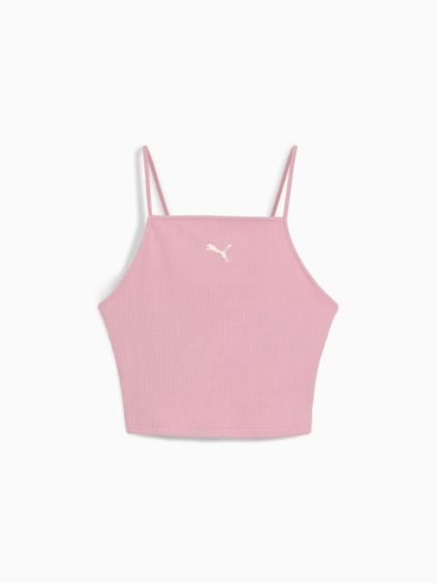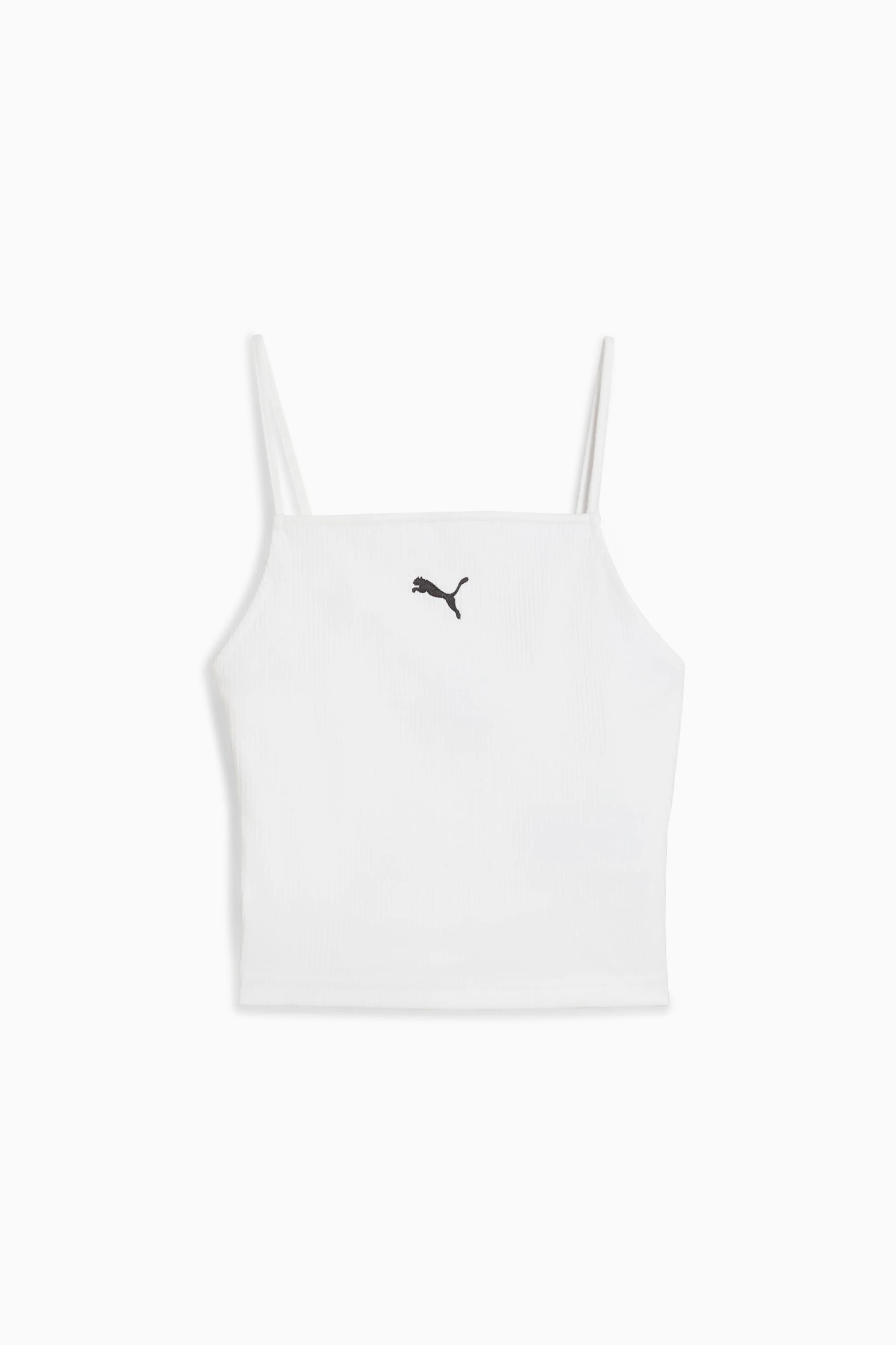 PRODUCT STORY Feel the freedom with this ribbed tank top. Featuring a centered logo and ribbed design, it's perfect for those who love to keep it simple yet striking. Make every moment count with PUMA's effortless style. FEATURES & BENEFITS - Made with at least 30% recycled materials DETAILS - Style: 629771_02 - Color: PUMA White - Tight fit - Rib fabric - Cropped length - Low Neckline - Spaghetti straps - PUMA branding details - PUMA branding details MATERIAL INFORMATION - Shell: 58% cotton, 39% polyester, 3% elastane