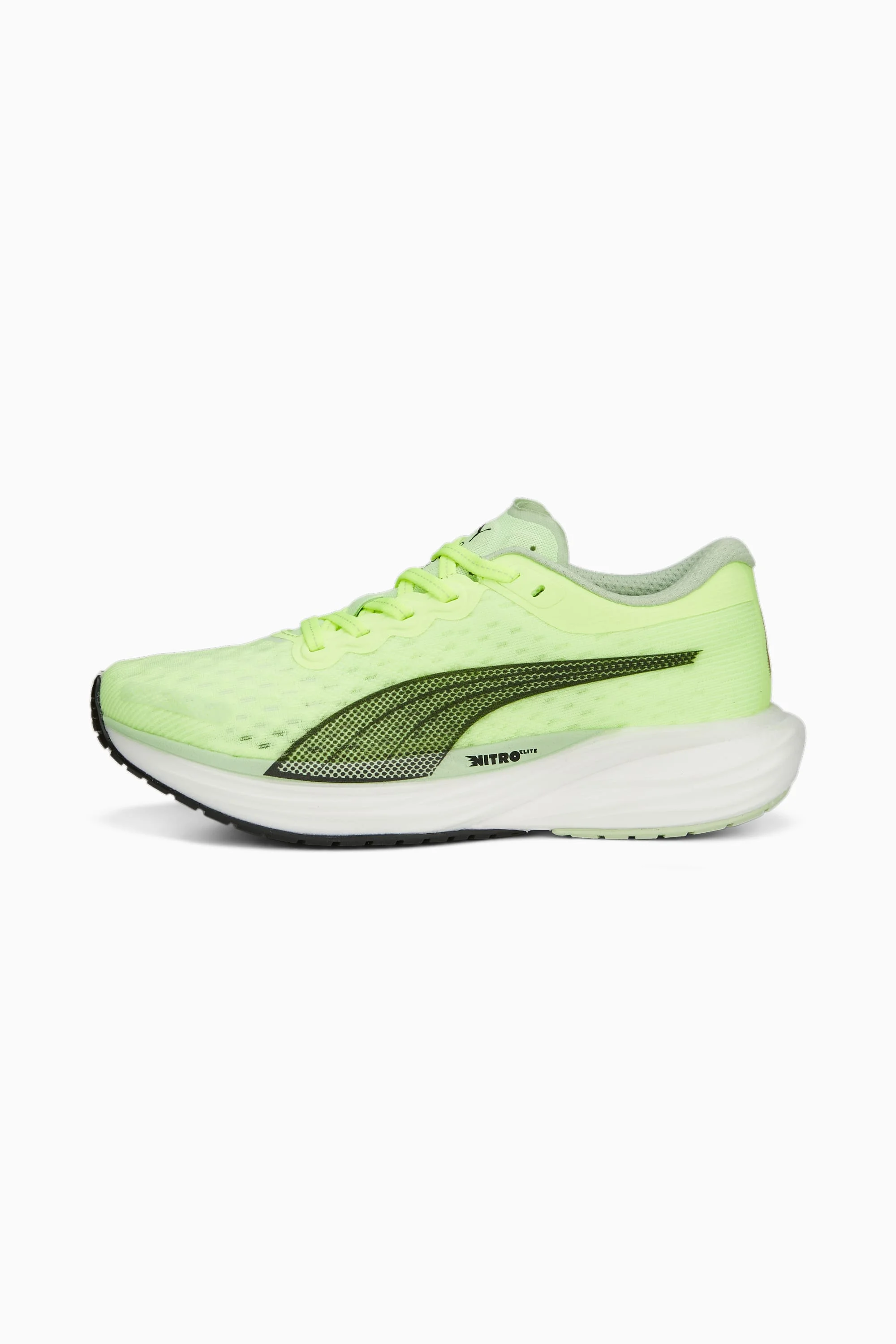 PRODUCT STORY The Deviate NITRO™ 2 – just like v1, only improved. It’s the max cushion, max performance running shoe that makes going faster even easier. The update includes NITROFOAM™ Elite for improved responsiveness, a reworked collar to reduce heel slip, and a lighter, asymmetrical base that works better with your body across all distances – be it short runs, marathons, or even ultras. This version has a unique colorway in celebration of our 75th anniversary. FEATURES & BENEFITS - NITRO™ Elite: Premium performance foam technology that provides pinnacle responsiveness in an extremely lightweight package - PWRPLATE: Innovative carbon composite plate designed for maximum energy transfer and optimised running efficiency - PWRTAPE: Targeted upper reinforcement for support and durability - PUMAGRIP: Durable performance rubber compound designed for all-surface traction DETAILS - Style: 377785_01 - Color: Fast Yellow-Light Mint - Breathable engineered mesh upper - Reflective design elements - TPU heel spoiler - Cushioning level: Max - Heel-to-toe drop: 6mm - Best for: Neutral pronators - Runner type: Frequent MATERIAL INFORMATION - Midsole: 100% Synthetic - Sockliner: 100% Textile - Outsole: 100% Rubber - Upper: 67% Textile, 33% Synthetic - Lining: 100% Textile