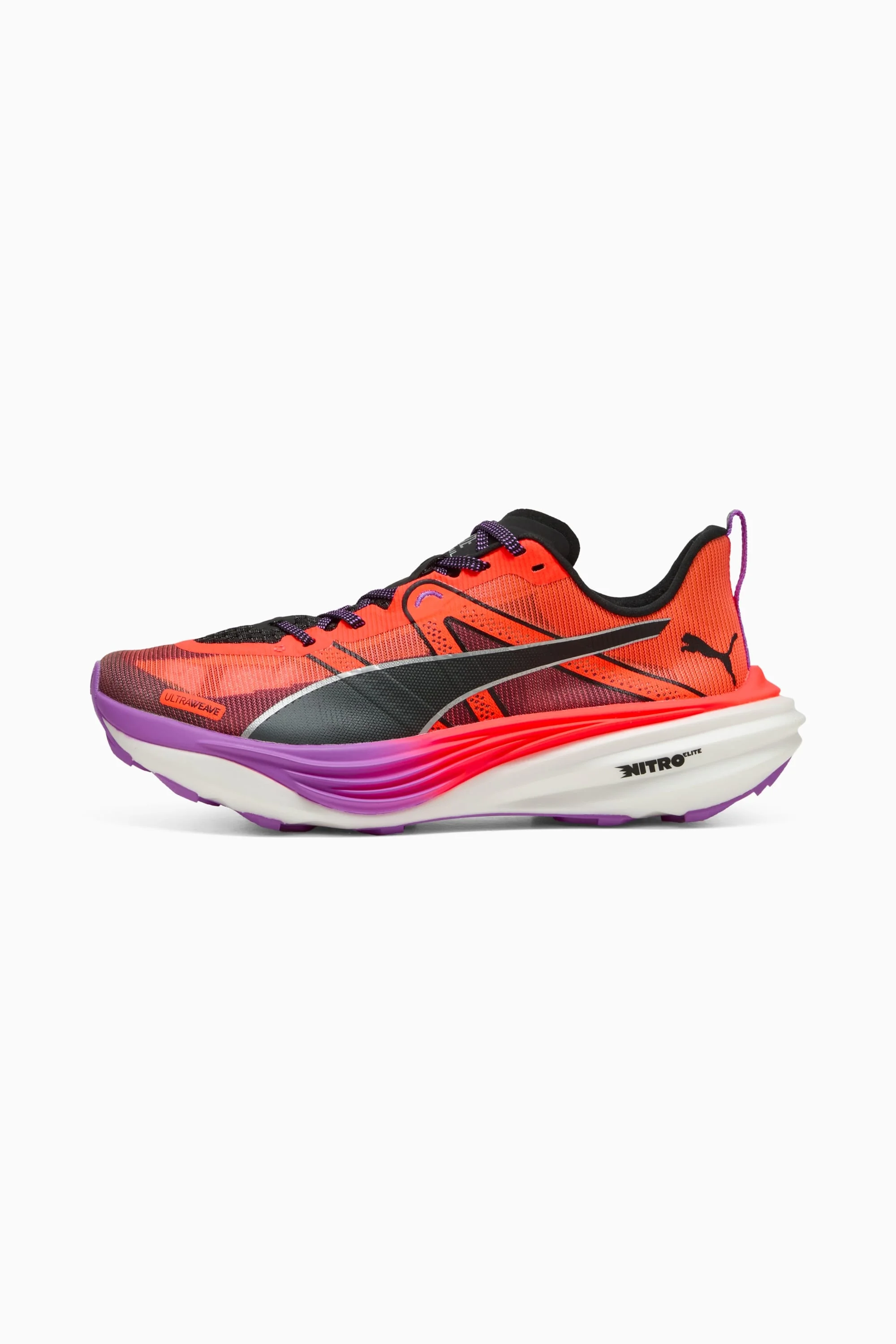 PRODUCT STORY The Deviate Elite Trail is an all-new high-performance running shoe designed for trail running. Take your route off-road with the Deviate Elite Trail’s rugged design and ready-for-anything details. Dominate the course with NITROFOAM™ ELITE and PWRPLATE tech that’s trail-tested for optimal energy return, cushioning, and comfort. From speed work on local trails to that race day moment, the Deviate Elite Trail can handle whatever you throw at it. FEATURES & BENEFITS - The upper of the shoes is made with at least 20% recycled materials - NITROFOAM™ Elite Cushioning: Innovative Nitrogen-infused foam technology that uses premium raw materials for maximal energy return on race day - PUMAGRIP ATR: Trail-ready performance rubber compound designed for traction on ice, mud, and unstable surfaces - PWRPLATE: Carbon fibre plate engineered to stabilise the midsole while maximising energy transfer DETAILS - Style: 310468_02 - Color: Glowing Red-PUMA Black-Pure Magenta - ULTRAWEAVE upper - Shoe weight: 245g (UK size 8) - Heel-to-toe drop: 6mm - Recommended for: neutral pronators - PUMA branding details MATERIAL INFORMATION - Midsole: 100% Synthetic - Sockliner: 100% Textile - Outsole: 100% Rubber - Upper: 63% Textile, 37% Synthetic - Lining: 100% Textile