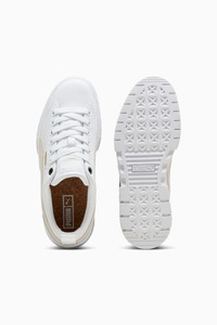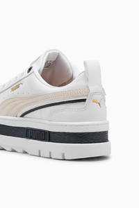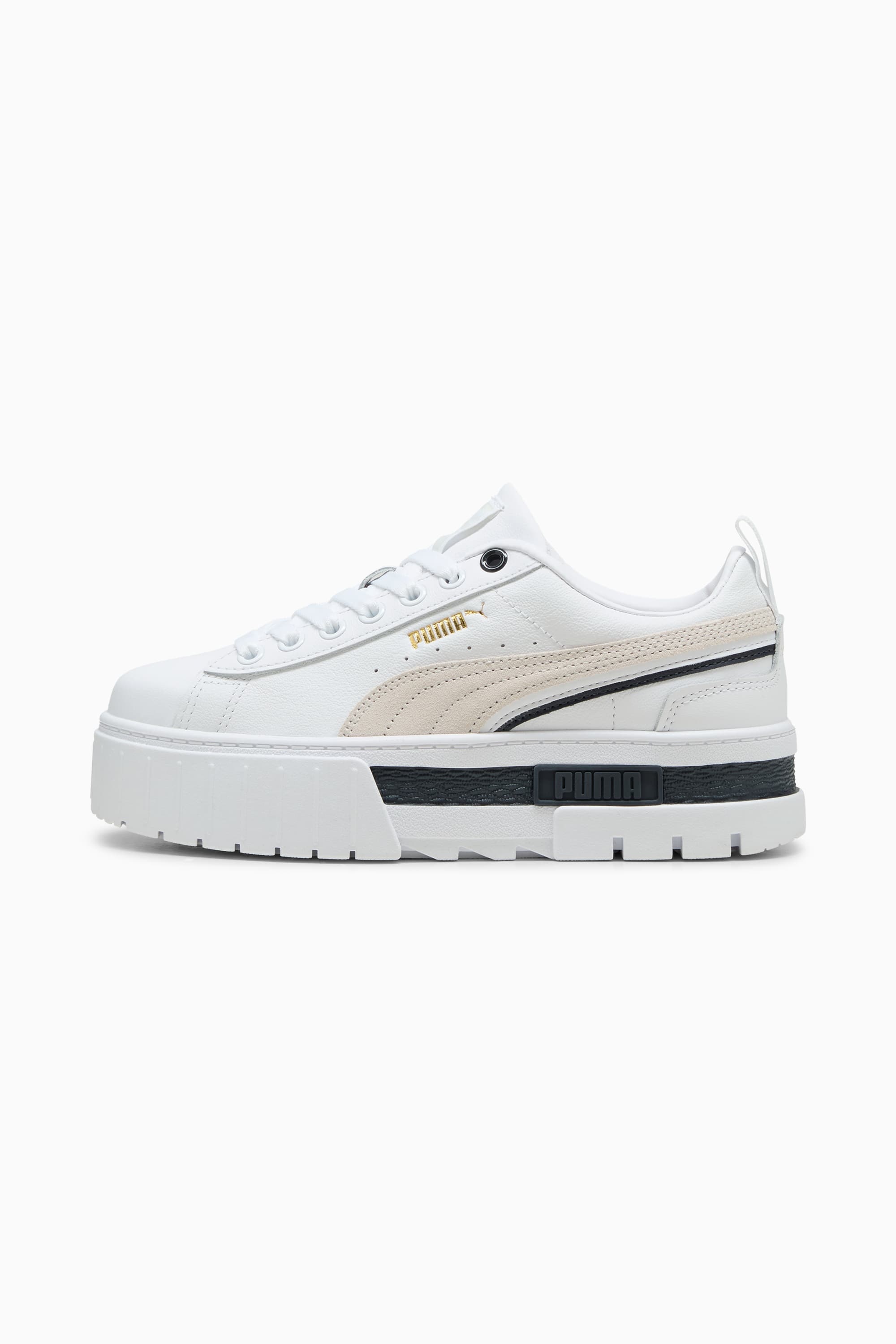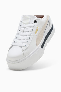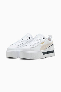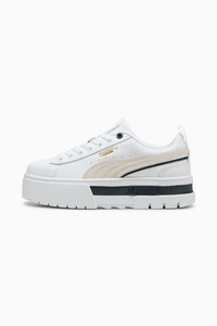 PRODUCT STORY For the hype girls, the street enthusiasts, the trend setters, we offer you: the Mayze. This stand-out model has a classic silhouette and stacked sole for a look that makes a statement, however you choose to style it. DETAILS - Style: 398573_01 - Color: PUMA White-PUMA Gold - Leather upper - Synthetic overlay on heel and textile eye stay - Suede formstrip - Deboss and foil printed PUMA branding on quarter panel and heel cap - Glossy finish eyelets / Stripe webbing loop on heel MATERIAL INFORMATION - Midsole: 100% Synthetic - Sockliner: 100% Textile - Outsole: 100% TR (Thermoplastic Rubber) - Upper: 90.29% Leather - cow, 6.67% Synthetic, 3.04% Textile - Lining: 59.13% Textile, 40.87% Synthetic