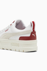 PRODUCT STORY Elevate your street style with the Mayze Leather Sneakers. These trendy platform sneakers offer a bold and stylish look that will turn heads wherever you go. With a sleek leather upper and a chunky platform sole, these sneakers provide both fashion and comfort. Step up your shoe game with the Mayze Leather Sneakers and make a statement with every stride. DETAILS - Style: 381983_48 - Color: PUMA White-Intense Red - Leather upper with suede and synthetic overlays - Full lace closure - Platform rubber midsole with textured tooling - Rubber outsole provides durable grip and traction - Suede PUMA Formstrip overlay at sides - Striped webbing pull loop at heel - Gold foil PUMA No.2 Logo at lateral side - PUMA label at tongue MATERIAL INFORMATION - Midsole: 100% Synthetic - Sockliner: 100% Textile - Outsole: 100% TR (Thermoplastic Rubber) - Upper: 70% Leather - cow, 27% Synthetic, 3% Textile - Lining: 62.64% Textile, 37.36% Synthetic