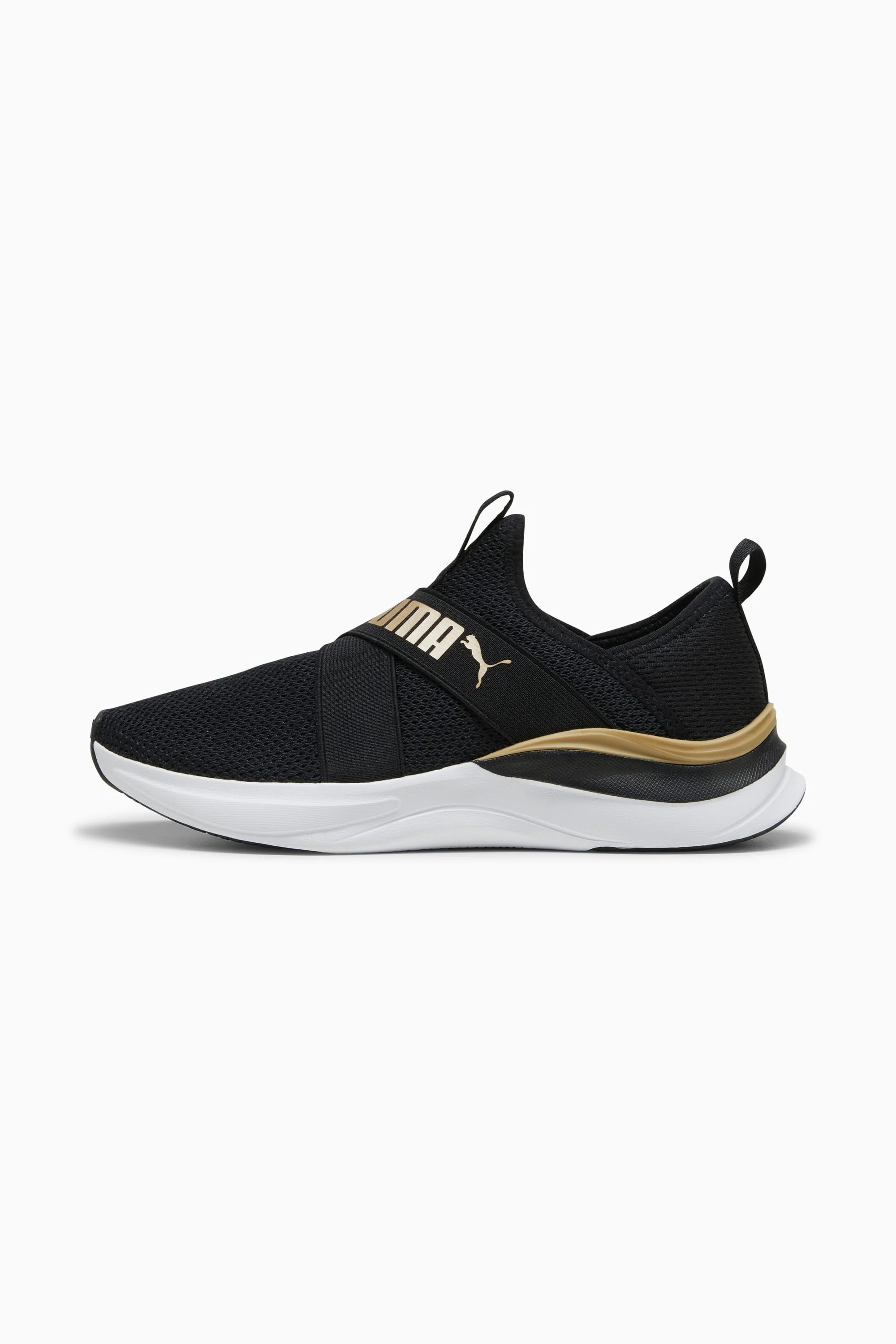 PRODUCT STORY The SOFTRIDE Harmony is a women-specific everyday lightweight trainer designed to help women tackle their entire day. With our SOFTRIDE foam midsole, this versatile trainer provides all-day comfort. The upper features an easy slip-on construction and a design that's an evolution rather than a complete reimagining. Feminine. Simple. Functional. FEATURES & BENEFITS - SOFTRIDE: Soft foam designed for all-day cushioning and comfort - SOFTFOAM+: Step-in comfort sockliner designed to provide soft cushioning thanks to its extra thick heel - The upper of the shoes is made with at least 20% recycled materials. DETAILS - Style: 379606_01 - Color: PUMA Black-PUMA White - Midsole: SOFTRIDE foam - Upper: lightweight design with elastic strap - Closure: Slip on - Rounded toe - PUMA wordmark across the upper MATERIAL INFORMATION - Midsole: 100% Synthetic - Sockliner: 100% Textile - Outsole: 74% Synthetic, 26% Rubber - Upper: 95.16% Textile, 4.84% Synthetic - Lining: 100% Textile