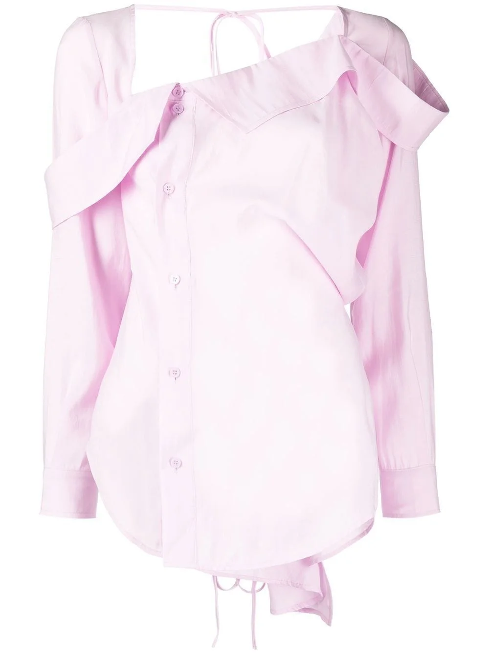 asymmetric-neck button-up shirt pink cut-out detailing asymmetric neck off-centre front button fastening rear tie fastening long sleeves curved hem Imported Composition Body: TENCEL™ 82%, Polyester 18% SIZE & FIT Model measurements Height 5 ft 10 in(1.78 m) Bust/Chest 33.46 in(85 cm) Hips 35.43 in(90 cm) Waist 24.4 in(62 cm) FittingInformation This piece fits true to size. We recommend you get your regular size Cut for a loose fit Made with a mid-weight non-stretch fabric Washing instructions Dry Clean Only