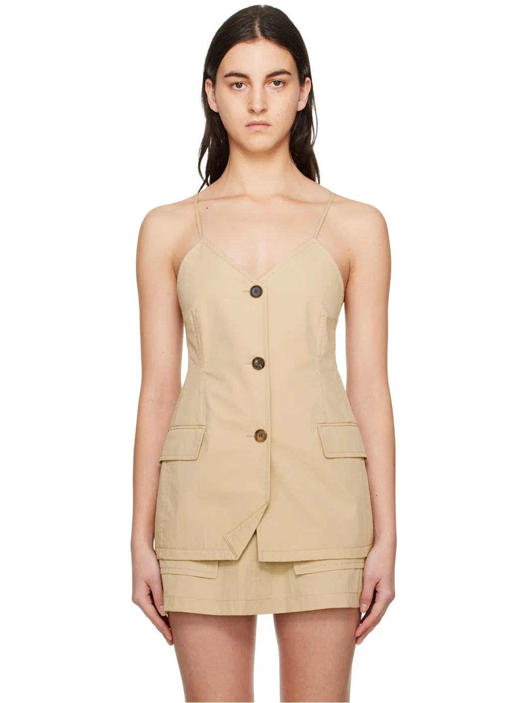 Cotton and nylon-blend twill camisole. · V-neck · Button closure · Darts at front · Flap pockets · Vent at back hem · Contrast stitching in white Supplier color: Beige Body: 69% cotton, 31% nylon. Lining: 100% cupro. Made in South Korea 231252F063020