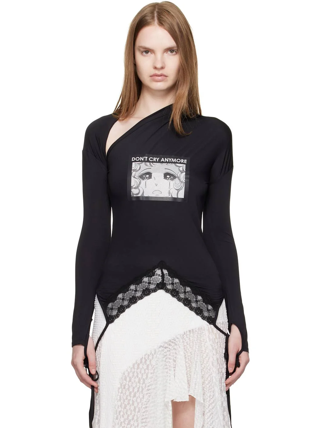 Stretch jersey and lace T-shirt. · Paneled construction · Draped asymmetric neck · Text and graphic printed at front · Self-tie straps at handkerchief hem Supplier color: Black 92% polyester, 8% polyurethane. Made in South Korea 252252F110024