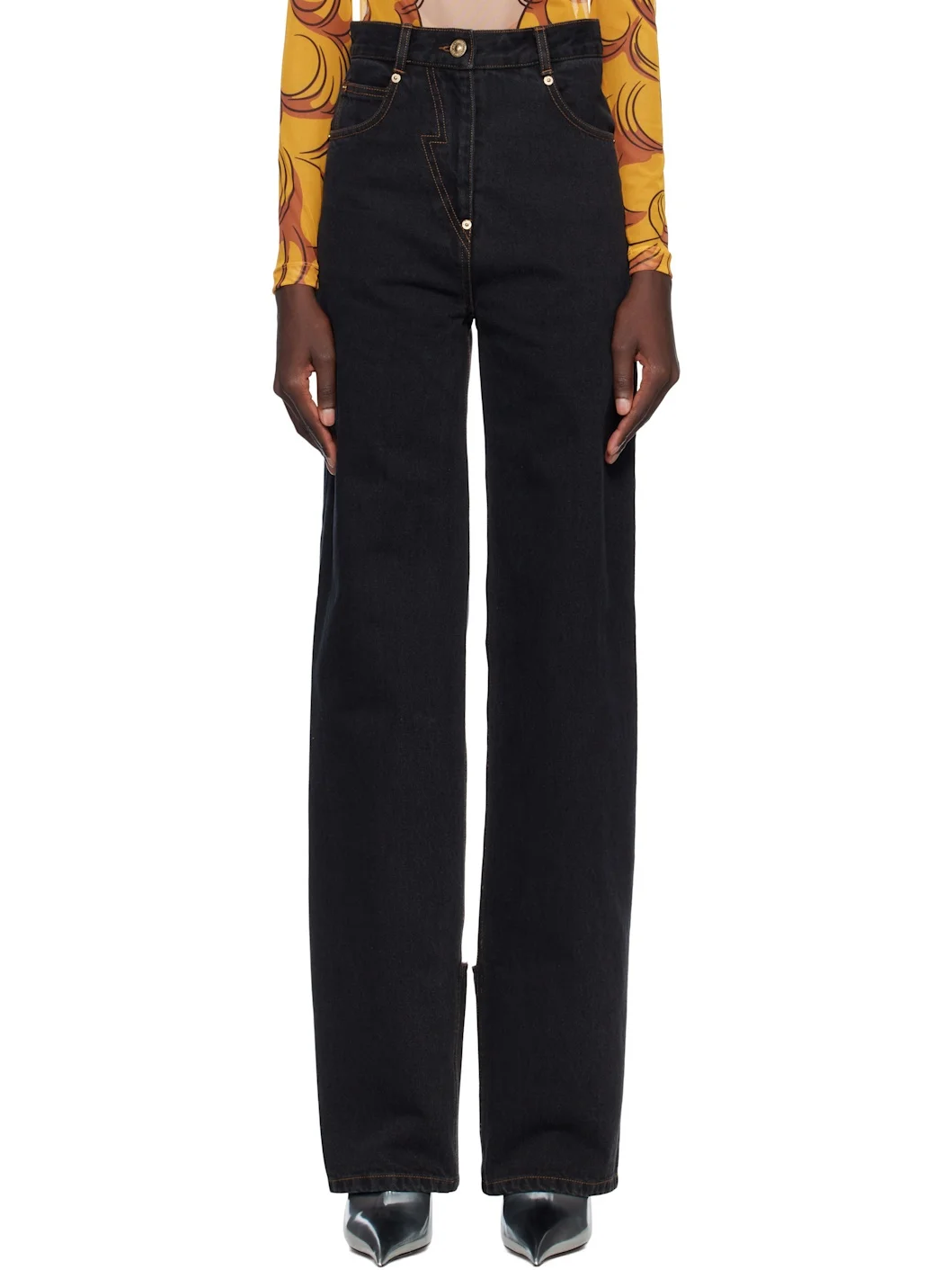 Tapered non-stretch denim jeans. Subtle fading throughout. · High-rise · Belt loops · Five-pocket styling · Zip fly · Logo patch at back waistband · Cutout at back legs · Logo-engraved gold-tone hardware · Contrast stitching in tan Supplier color: Black 100% cotton. Made in South Korea 251252F069028