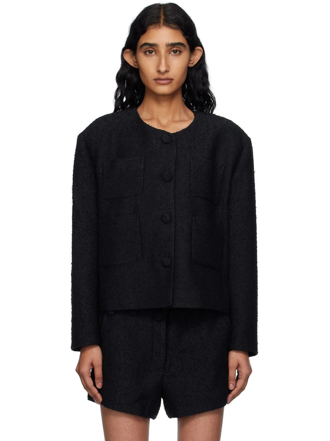 Boucle tweed jacket. · Round neck · Button closure · Patch pockets at front · Padded shoulders · Full satin lining Supplier color: Bk Body: 100% polyester. Lining: 100% polyester. Made in South Korea 252252F063017