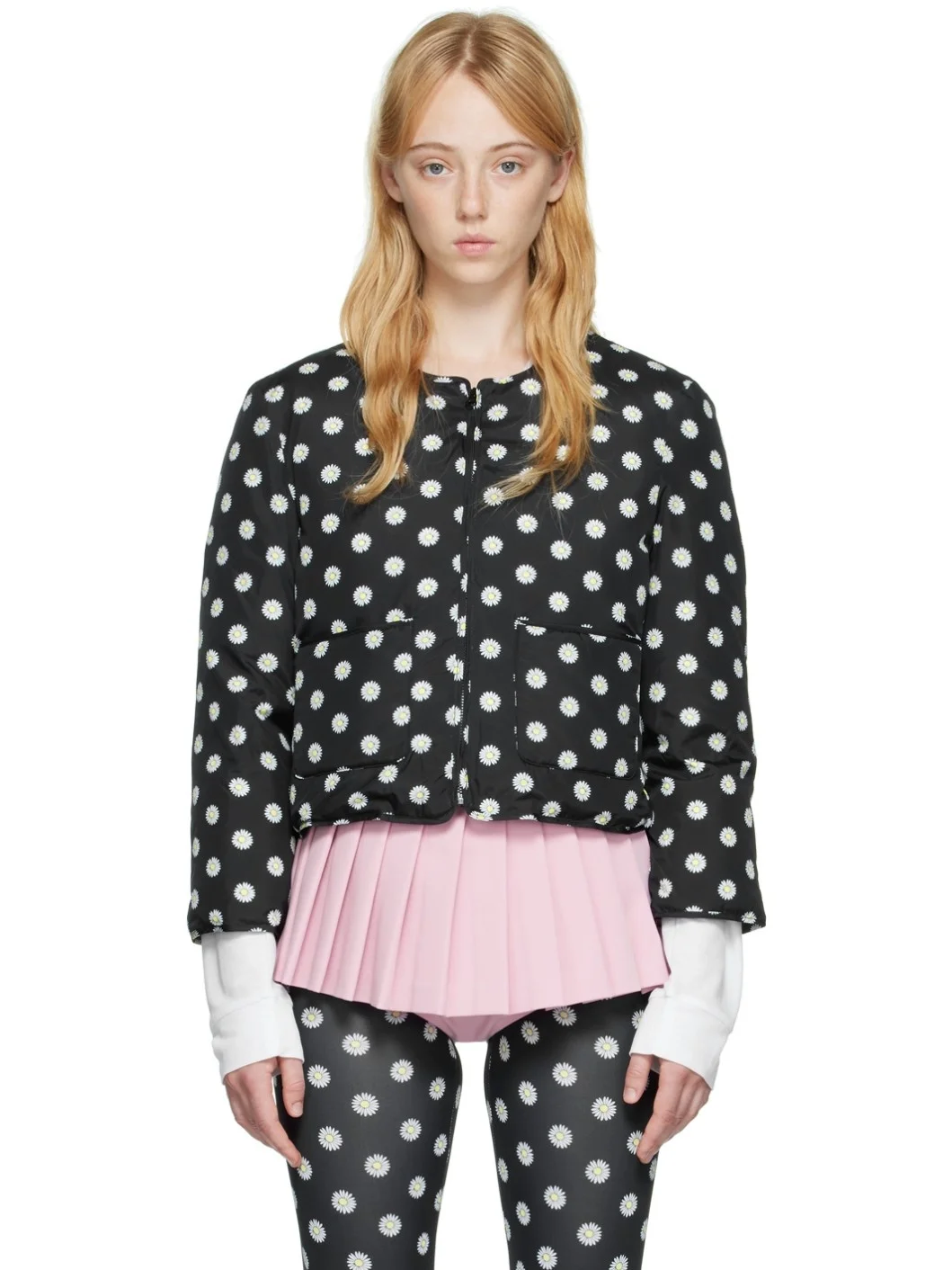 Down-filled polyester taffeta jacket. Graphic pattern printed throughout. · Square neck · Zip closure · Patch pockets · Vents at hem · Full taffeta lining Supplier color: Black Fill: 90% duck down, 10% duck feathers. 100% polyester. Made in South Korea 222252F061000