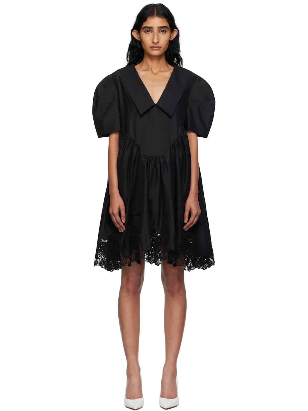 Plain-woven linen-blend minidress. · Chelsea collar · Patch pocket at chest · Gathering at waist · Seam pockets · Lace trim at hem · Fully lined Supplier color: Black Body: 36% linen, 35% nylon, 29% cotton. Trim: 100% cotton. Made in South Korea 252252F052006