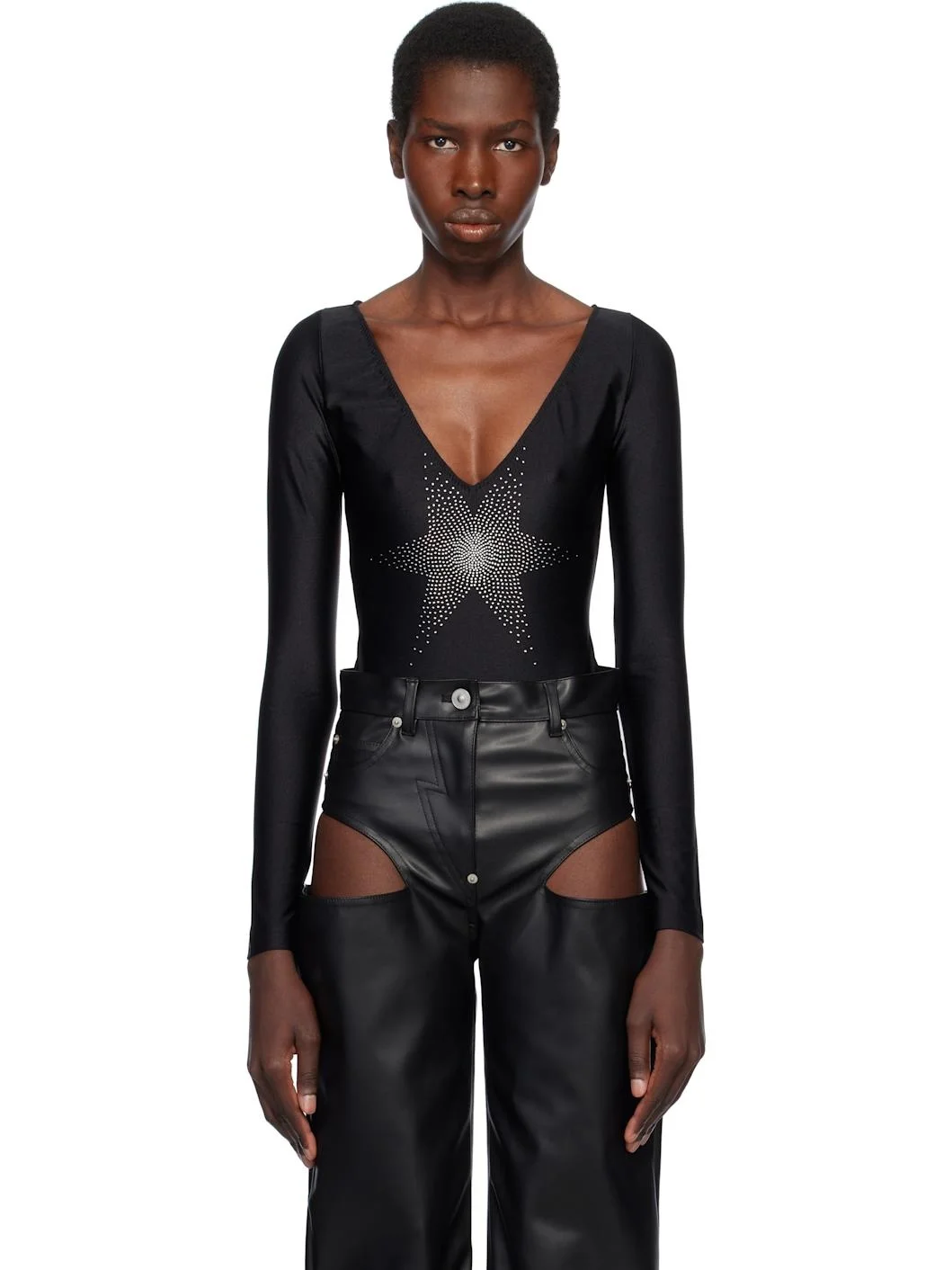 Nylon-blend lame jersey bodysuit. · Elasticized plunging V-neck and hem · Studded graphic at front · Press-stud fastening at bottom Supplier color: Black 80% nylon, 20% polyester. Made in South Korea 251252F358000