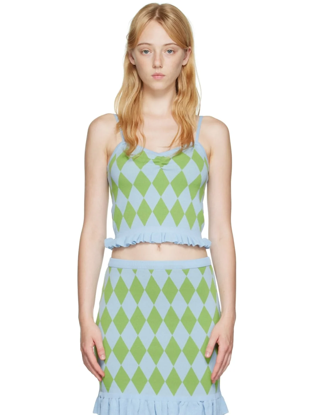 Rayon-blend jersey tank top. Jacquard knit argyle pattern throughout. · Adjustable spaghetti shoulder straps · Scoop neck · Ruffled hem Supplier color: Blue/Green 50% rayon, 50% polyester. Made in South Korea 222252F111007