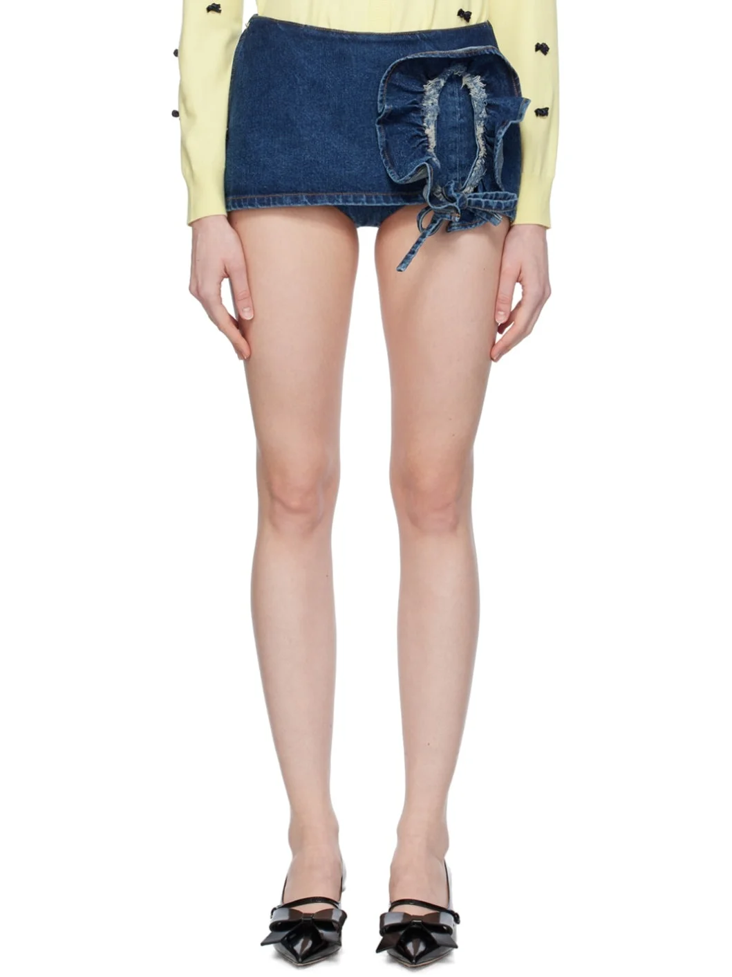 Non-stretch denim skort. · Layered construction · Ruffles trim at front · Self-tie fastening at vented hem · Zip closure at back · Logo patch at back waistband · Brief-style underlay · Partial cotton poplin lining · Contrast stitching in tan Supplier color: Blue Body: 100% cotton. Lining: 100% cotton. Made in South Korea 241252F088029