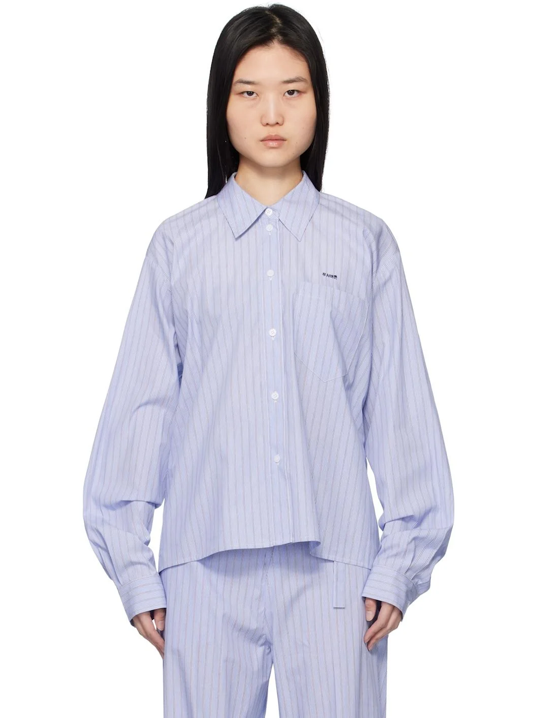 Cotton poplin shirt. Stripes throughout. · Spread collar · Button closure · Logo embroidered at chest · Patch pocket · Dropped shoulders · Pleats at single-button barrel cuffs · Draping, cutout, and button closure at back · Straps at interior Supplier color: White/Blue 100% cotton. Made in South Korea 251252F109011