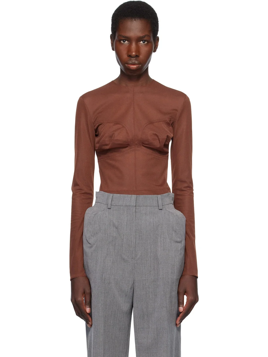 Sheer polyester mesh top. · Paneled construction · Crewneck · Concealed zip closure at back Supplier color: Brown 100% polyester. Made in South Korea 251252F110051