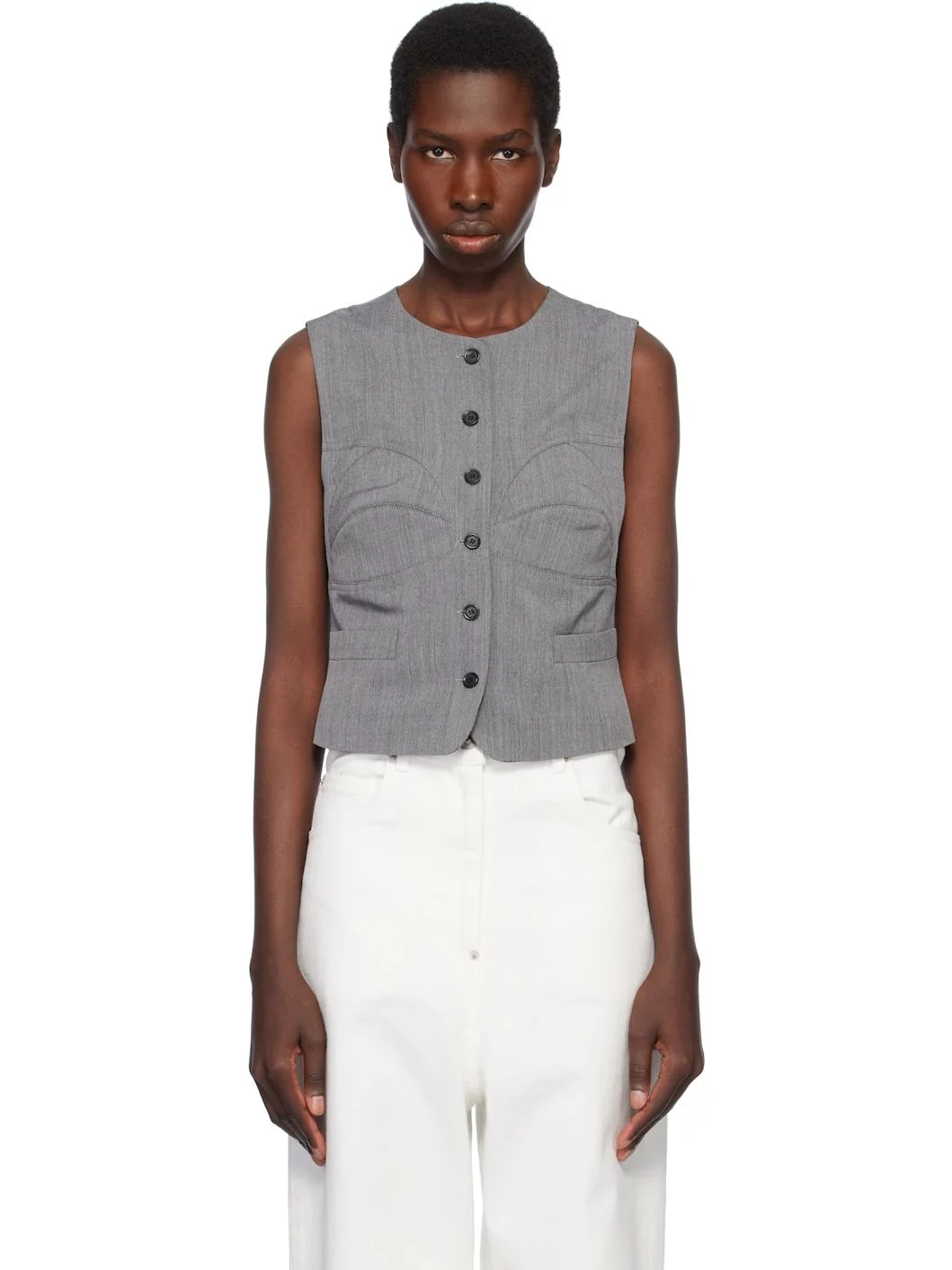 Wool delaine vest. · Paneled construction · Round neck · Button closure · Padded cups · Welt pockets · Cinch strap at back · Full satin lining Supplier color: Grey Body: 100% wool. Lining: 100% cupro. Made in South Korea 251252F099002
