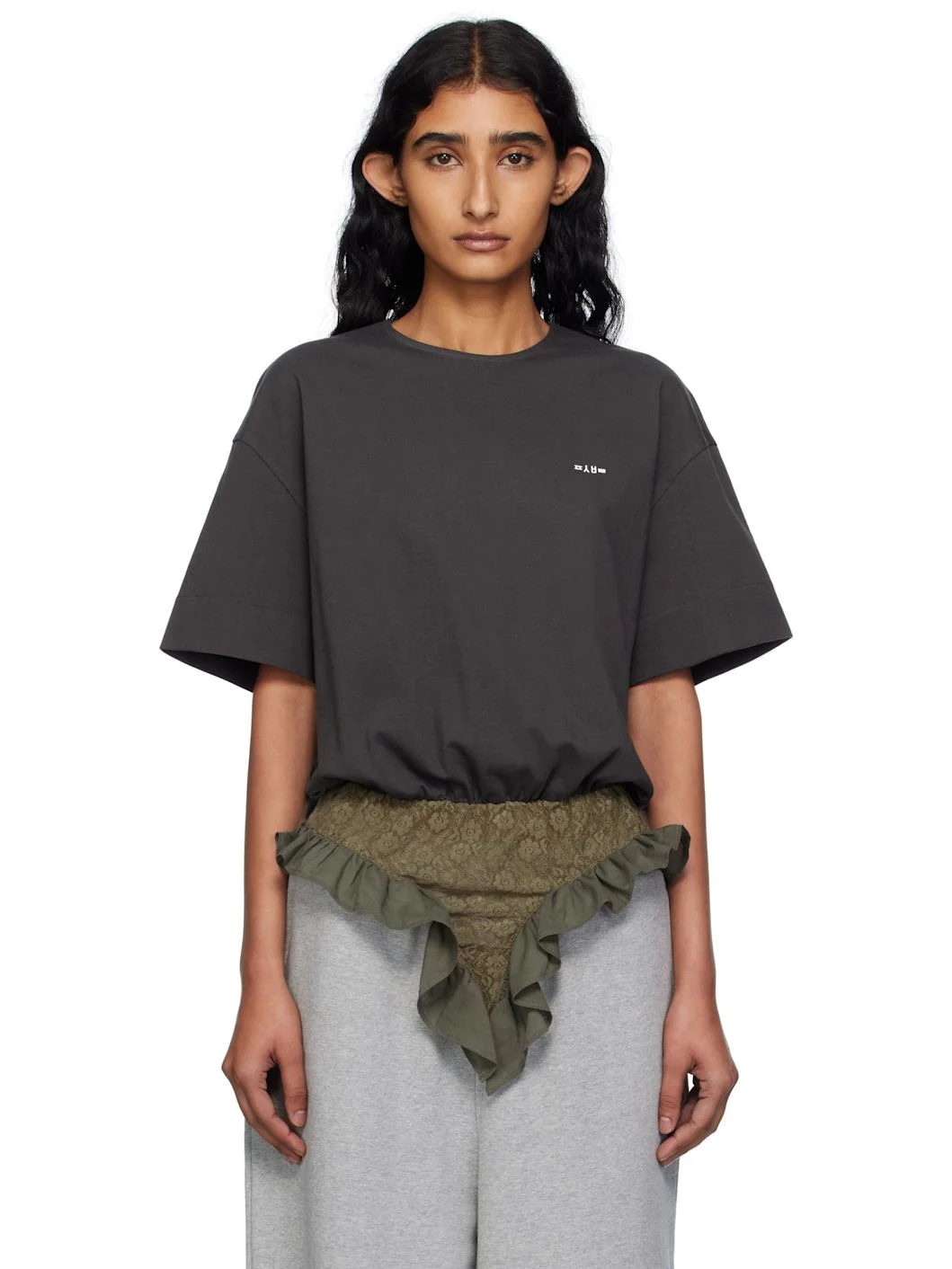 Cotton jersey T-shirt. · Crewneck · Text printed at chest · Lace and ruffled trim at elasticized hem · Button fastening at back collar Supplier color: Dgr Body: 100% cotton. Trim 1: 97% nylon, 3% spandex. Trim 2: 100% cotton. Made in South Korea 252252F110020