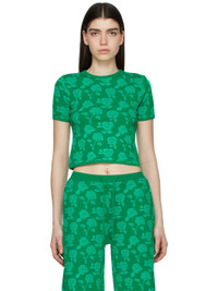 Knit polyester and rayon-blend T-shirt. · Floral pattern printed throughout · Rib knit crewneck, cuffs, and hem Supplier color: Green 51% polyester, 49% rayon. Made in South Korea 221252F110045