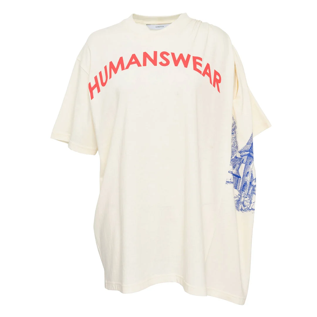The pushBUTTON Humanswear Double Sleeve T-Shirt delivers contemporary streetwear with artistic graphic details and innovative construction. Crafted from premium cotton in ivory, featuring bold red typography and intricate blue botanical illustrations. The oversized silhouette and asymmetric double sleeve design create a distinctive statement piece for modern wardrobes.