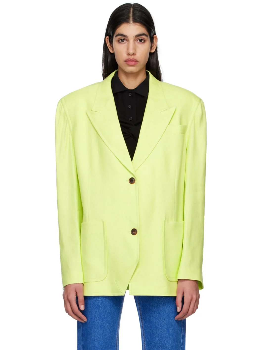 Linen and rayon-blend twill blazer. · Peaked lapel · Button closure · Welt pocket at chest · Patch pockets · Padded shoulders · Twin vents at back hem · Full satin lining Supplier color: Lime 66% linen, 34% rayon. Made in South Korea 231252F057003