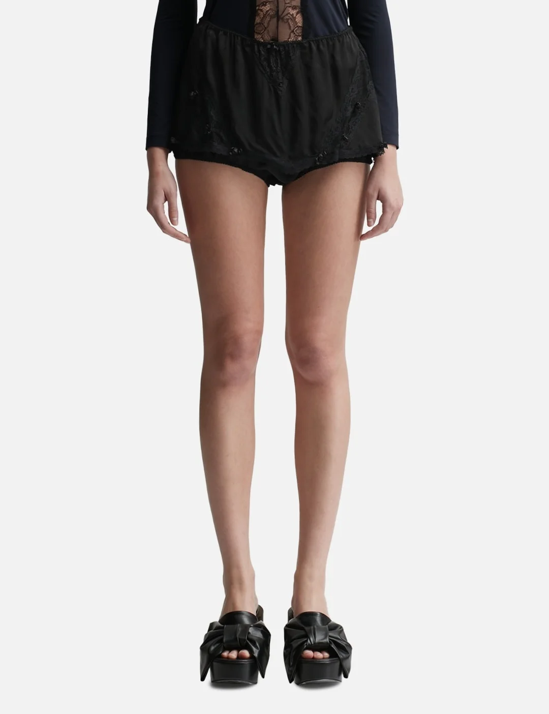 - PUSHBUTTON - Mini Flower Lounge Skort - Soft rayon fabric - Elasticated waistband - Lace trims - Color: Black - Material: 100% Rayon - See more Skirts and Clothing SIZING - Model wears size S - Model measures: Height 173cm, Chest 32”/81cm, Waist 23’’/58.42cm, Hip 34”/86.4cm