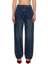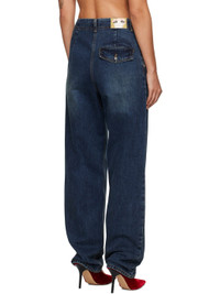 Relaxed-fit tapered non-stretch denim jeans. Fading throughout. · Belt loops · Three-pocket styling · Zip-fly · Pleats at front · Creased legs · Logo patch at back waistband · Contrast stitching in tan Supplier color: Dark blue 100% cotton. Made in South Korea 242252F069018