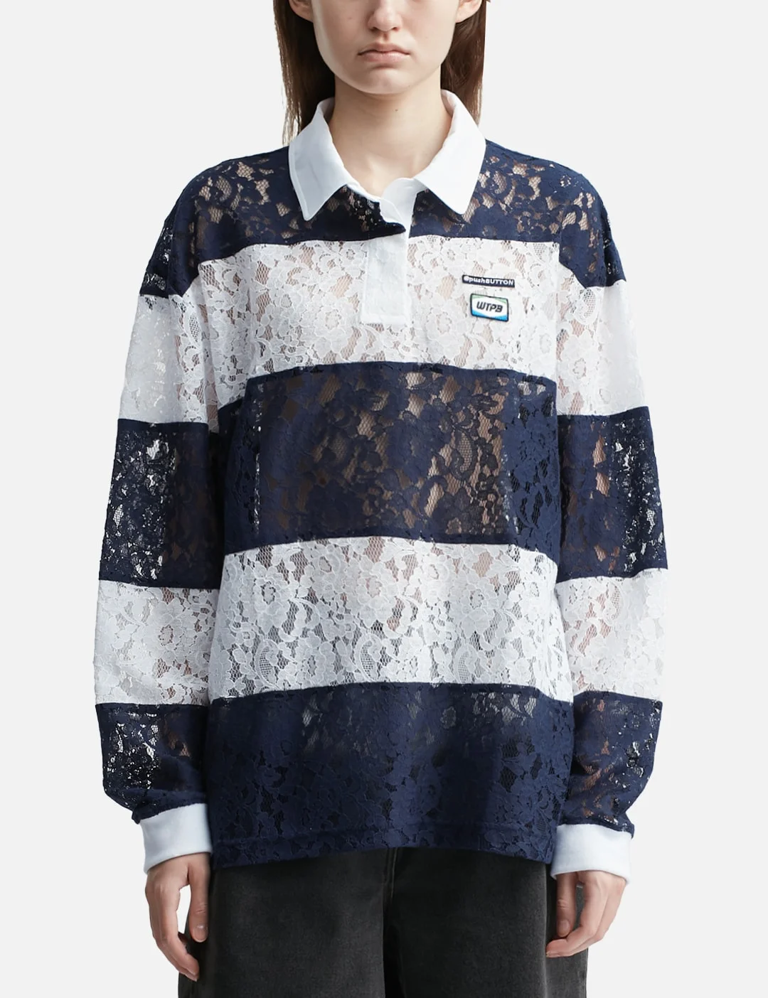 - pushBUTTON - Navy Lace Stripe Pique Top - Striped lace body - Spread collar - Button closure - Logo patched on chest - Long sleeve - Ribbed cuffs - Made in Korea - Color: White/ Navy - Material: 70% Cotton, 30% Nylon - See more T-Shirts and Clothing - Vendor Code: PB2610216W