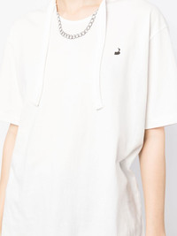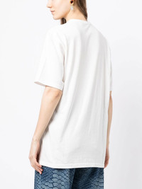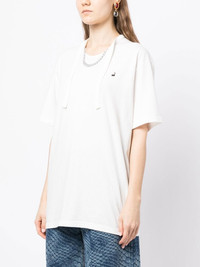 necklace-print oversized T-shirt off-white cotton logo print at the chest graphic print at the chest strap detailing round neck short sleeves straight hem Imported Composition Body: Cotton 100% SIZE & FIT Model measurements Height 5 ft 11 in(1.8 m) Bust/Chest 28.34 in(72 cm) Hips 35.43 in(90 cm) Waist 23.62 in(60 cm) FittingInformation This piece fits true to size. We recommend you get your regular size Cut for a relaxed fit Made with a mid-weight fabric Washing instructions Hand Wash