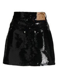 patent-finish mini skirt black patent leather A-line front button and zip fastening two rounded pockets to the sides two rear patch pockets logo patch to the rear belt loops Imported Composition Body: Polyethylene Terephthalate (PET) 100% Washing instructions Machine Wash