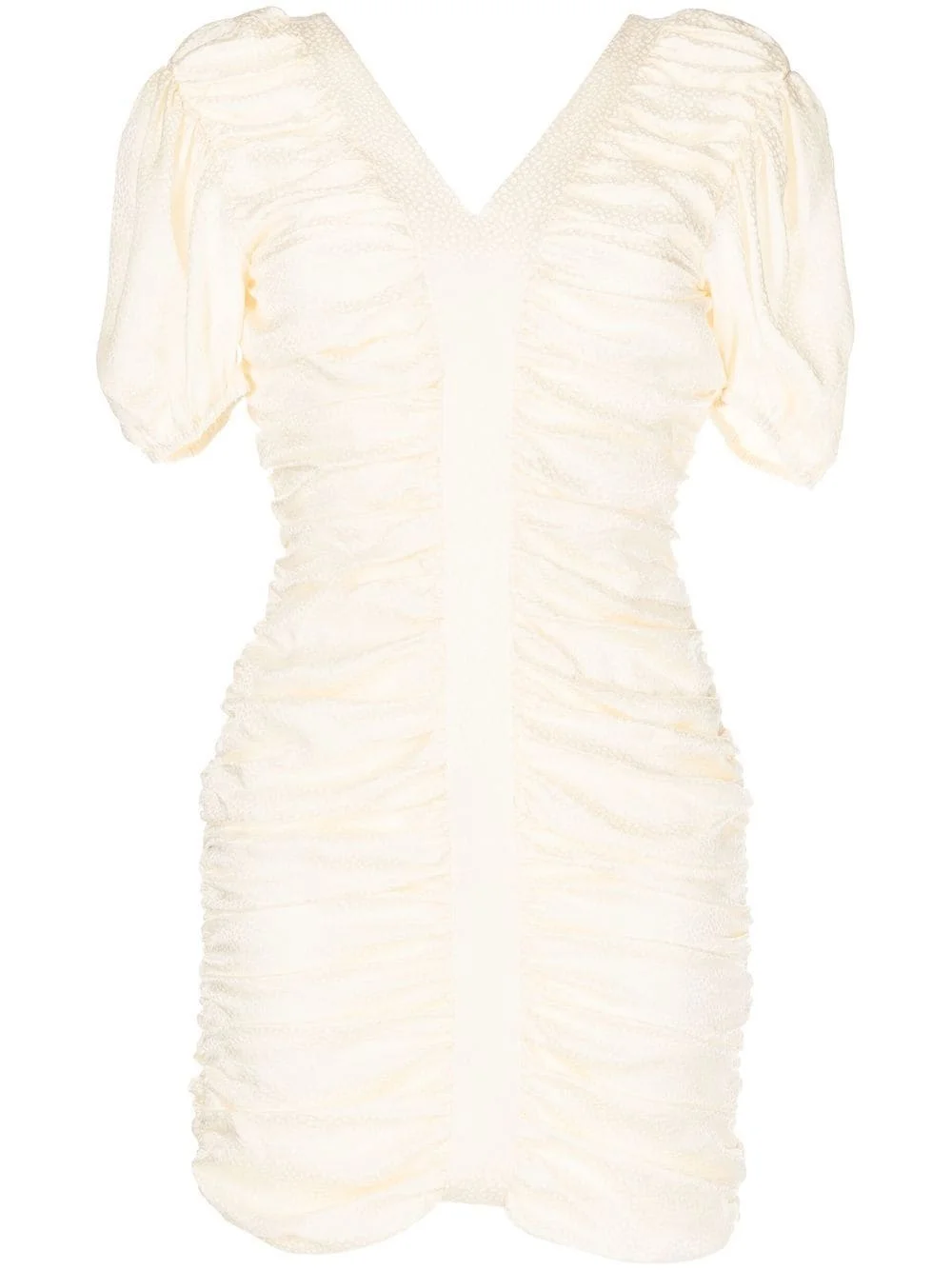 ruched mini dress cream white silk ruched detailing V-neck balloon sleeves Imported Composition Silk 100% SIZE & FIT Model measurements Height 5 ft 11 in(1.8 m) Bust/Chest 28.34 in(72 cm) Hips 35.43 in(90 cm) Waist 23.62 in(60 cm) FittingInformation This piece fits true to size. We recommend you get your regular size Cut for a slim fit Made with a mid-weight non-stretch fabric Washing instructions Dry Clean Only