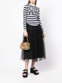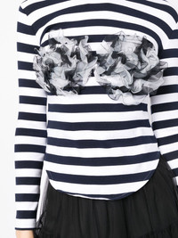 ruffle striped top navy blue white stretch-cotton ruffled detailing stripe print crew neck long sleeves Imported Composition Body: Cotton 95%, Spandex/Elastane 5% SIZE & FIT Model measurements Height 5 ft 11 in(1.8 m) Bust/Chest 28.34 in(72 cm) Hips 35.43 in(90 cm) Waist 23.62 in(60 cm) FittingInformation This piece fits true to size. We recommend you get your regular size Cut for a slim fit Made with a mid-weight stretch fabric Washing instructions Dry Clean Only