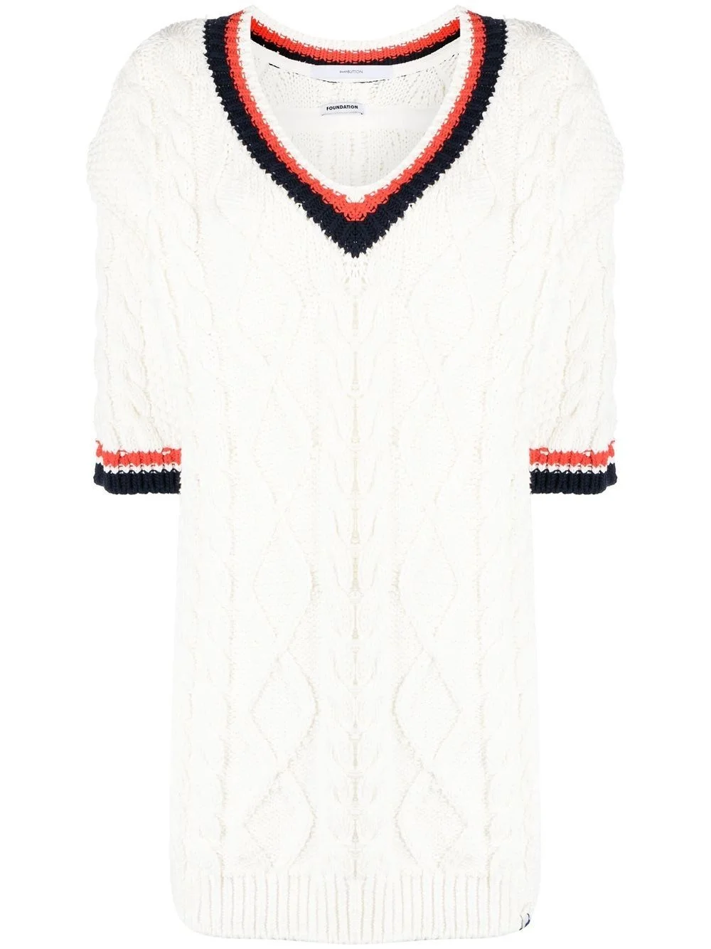 three-quarter sleeve cable-knit top off-white cotton blend cable knit V-neck three-quarter length sleeves striped border ribbed hem Imported Composition Body: Cotton 78%, Polyester 22% SIZE & FIT Model measurements Height 5 ft 11 in(1.8 m) Bust/Chest 28.34 in(72 cm) Hips 35.43 in(90 cm) Waist 23.62 in(60 cm) FittingInformation This piece fits true to size. We recommend you get your regular size Cut for a loose fit Made with a mid-weight fabric Washing instructions Dry Clean Only