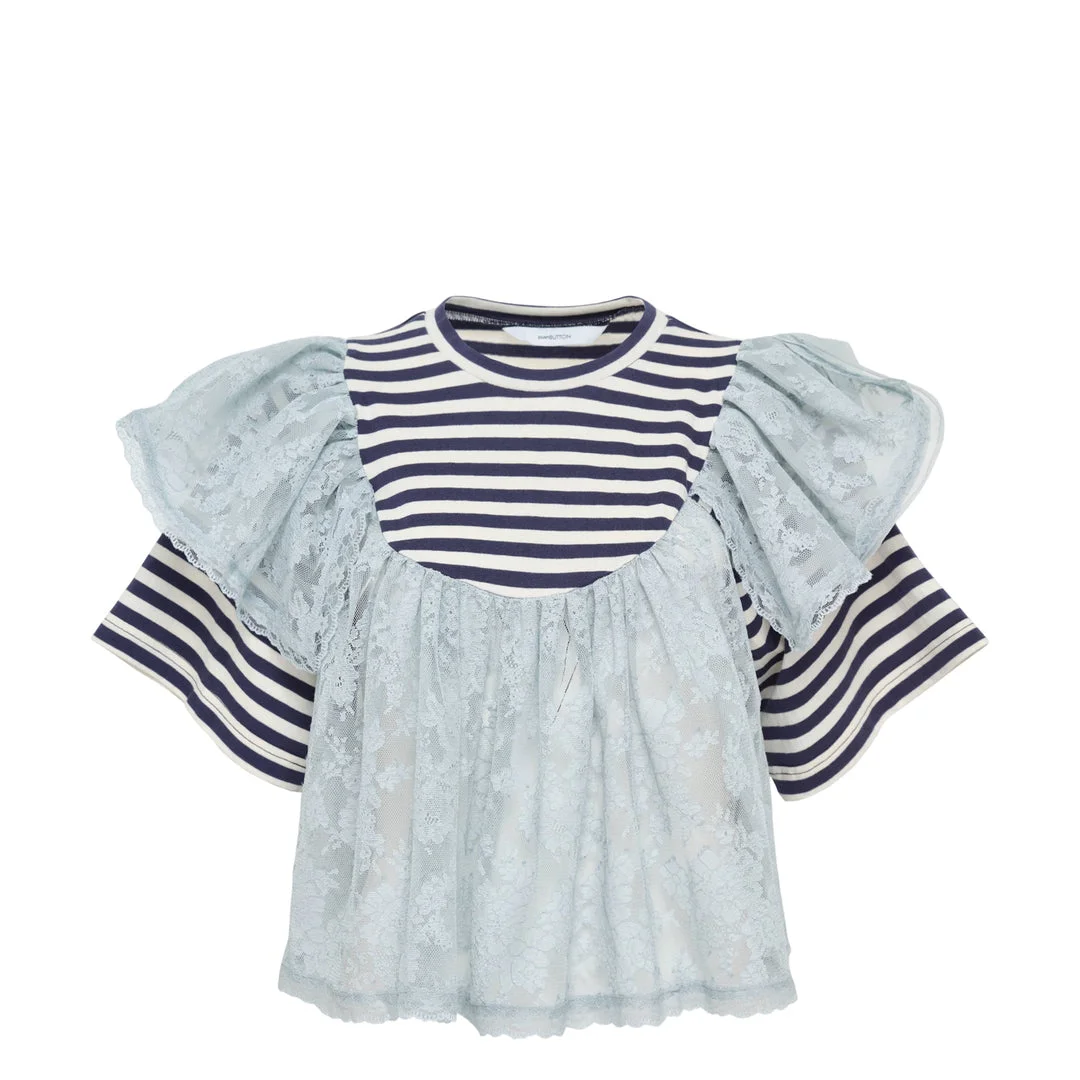 The pushBUTTON Voluminous Sleeveless Shirt delivers contemporary femininity with dramatic silhouette and layered construction. Featuring a navy striped cotton base with pale mint lace overlay, creating textural contrast and dimensional volume through gathered sleeves and ruffled details. The innovative design combines classic nautical stripes with romantic lace elements for a modern hybrid aesthetic.