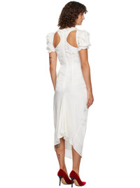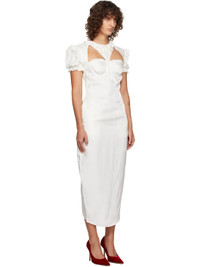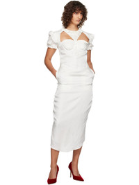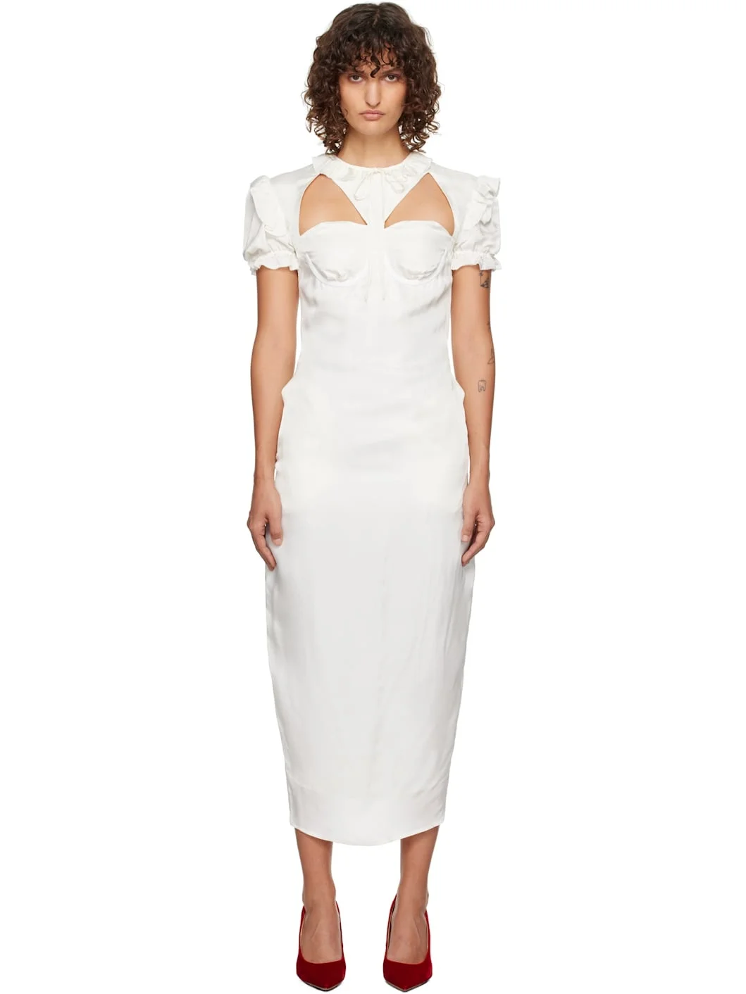 Rayon satin midi dress. Ruffled trim throughout. · Self-tie fastening at crewneck · Cutouts at chest · Underwire at bust · Seam pockets · Puff sleeves · Elasticized cuffs · Concealed zip closure at racerback · Godet panel at back hem · Fully lined Supplier color: White 100% rayon. Made in South Korea 242252F055000