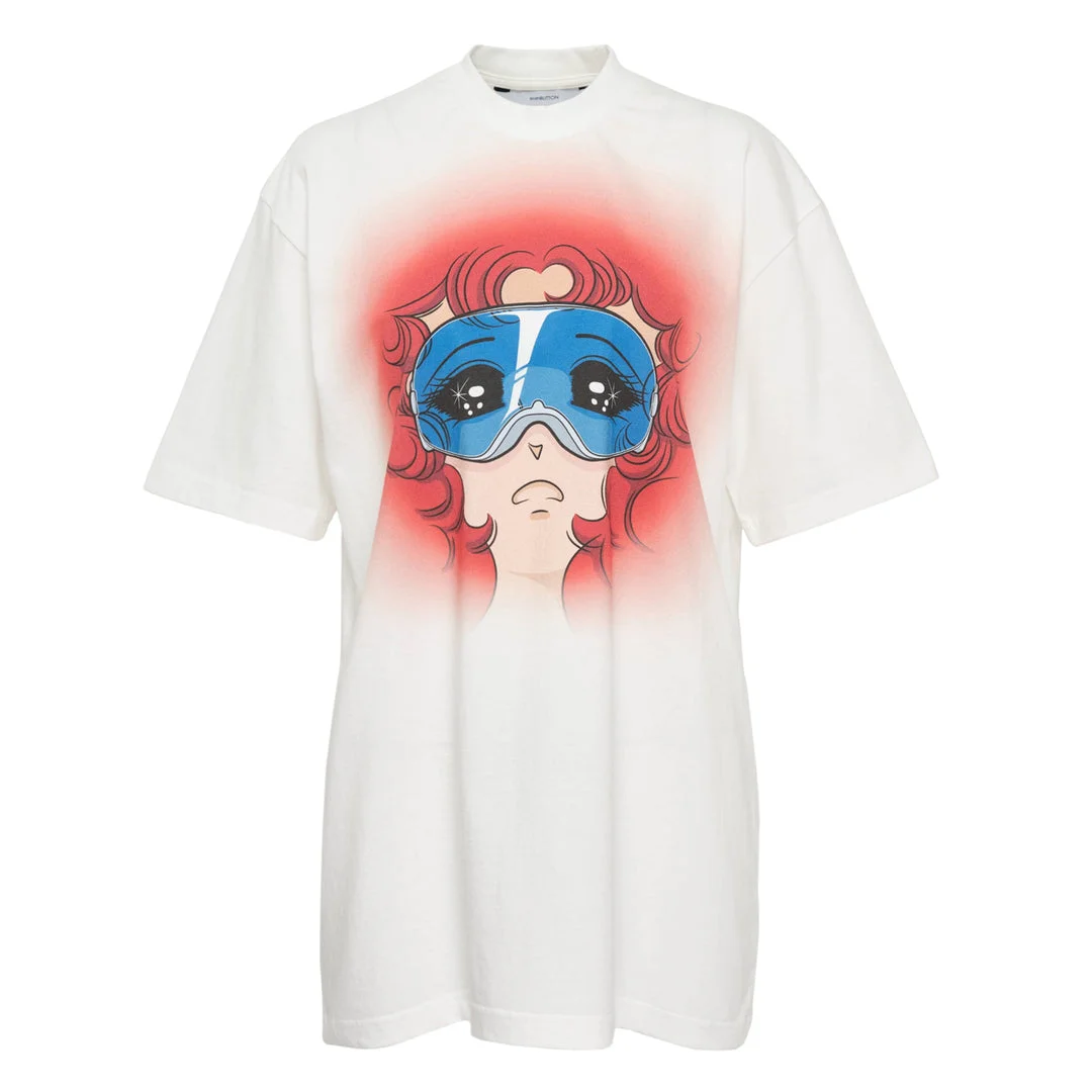 The pushBUTTON White Goggles Girl T-Shirt delivers contemporary Korean streetwear with bold graphic storytelling and avant-garde design. Crafted from premium cotton in crisp white, featuring an oversized illustrated character with blue goggles and flowing red hair in a gradient red halo effect. The oversized fit and statement graphic create a distinctive piece that embodies pushBUTTON's playful yet sophisticated aesthetic.