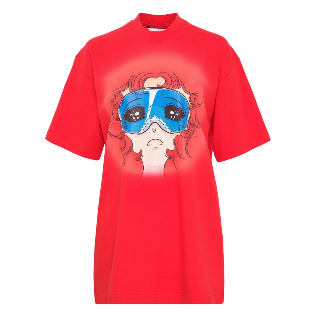 pushBUTTON White Goggles Girl T-Shirt delivers Korean streetwear innovation with playful graphic storytelling. Crafted from premium cotton jersey in vibrant red, featuring an oversized illustrated character with blue goggles and flowing red hair. The relaxed oversized silhouette and signature pushBUTTON anime-inspired artwork create a bold statement piece for contemporary streetwear enthusiasts.