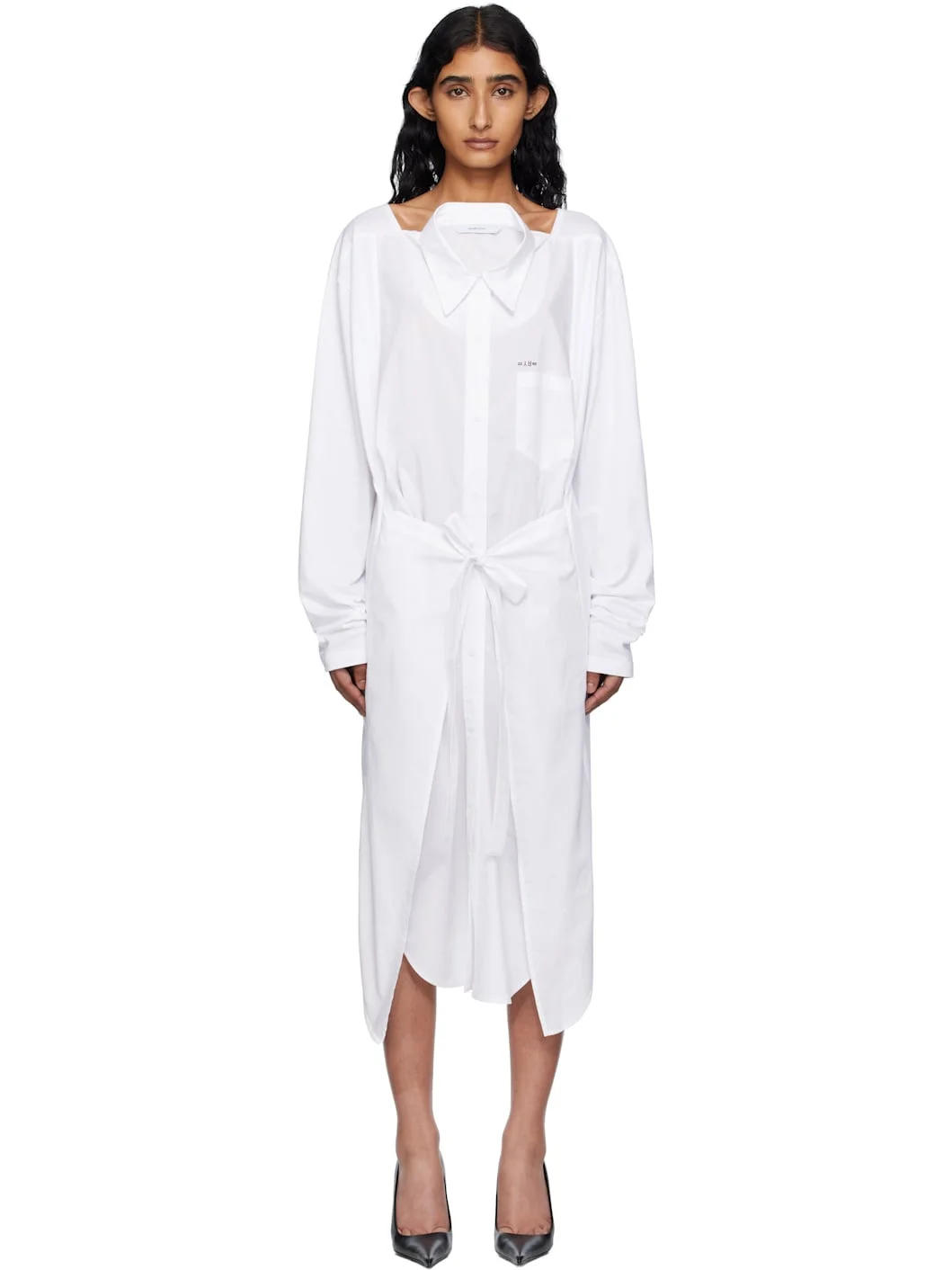 Cotton poplin and jersey midi dress. · Paneled construction · Square neck · Spread collar for alternate styling · Button closure · Printed text and patch pocket at chest · Self-tie fastening at waist · Seam pockets · Shirttail hem · Dropped shoulders Supplier color: White Body 1: 100% cotton. Body 2: 100% cotton. Made in South Korea 252252F054000