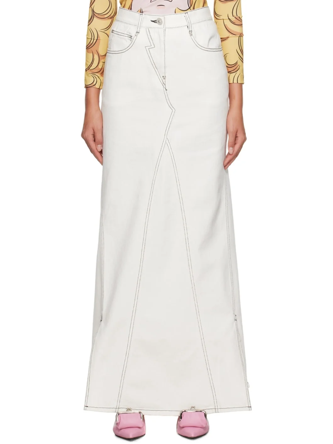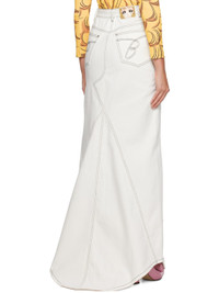 Non-stretch denim skirt. · Belt loops · Five-pocket styling · Zip-fly · Vents at asymmetric hem · Leather patch at back waistband · Contrast stitching in black Supplier color: White 100% cotton. Made in South Korea 232252F093000
