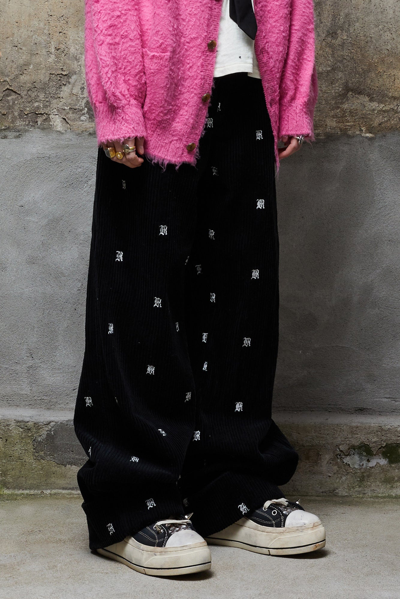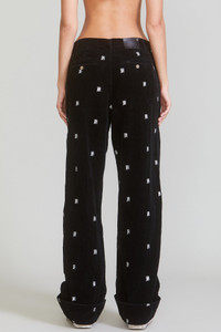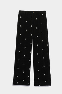 Wide leg chino featuring embroidered R13 logos all over the garment and made with Japanese corduroy. - Color: Black with R13 Logos - Eli is 5’8” and wearing size 27 - Bust 30”; Waist 23”; Hips 33” - 100% Cotton - R13WR078-R153B